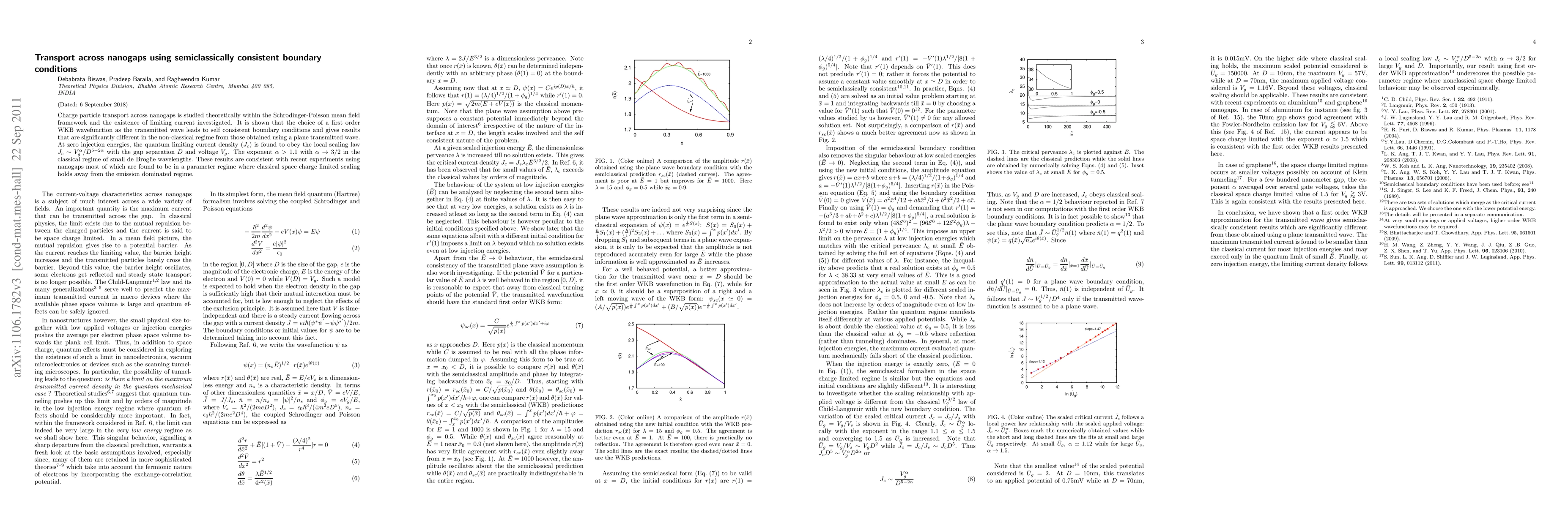 Researchers studied charge transport across nanogaps using semiclassically consistent boundary conditions, finding that quantum effects lead to a limiting current density obeying the local scaling law at zero injection energies.
