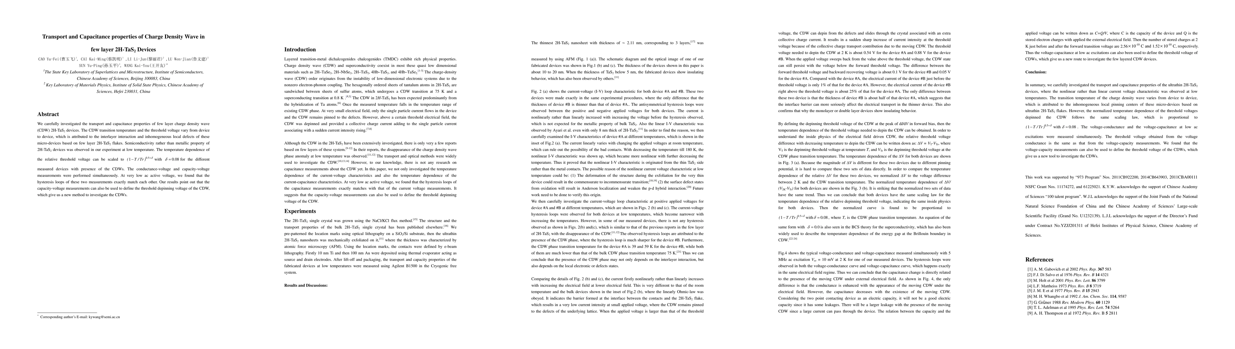 This study investigates the transport and capacitance properties of few-layer charge density wave (CDW) 2H-TaS2 devices, revealing semiconducting behavior at low temperatures. The CDW transition temperature and threshold voltage vary due to interlayer interactions and local defects, and capacity-voltage measurements can define the CDW threshold depinning voltage, offering a new method to study CDWs.