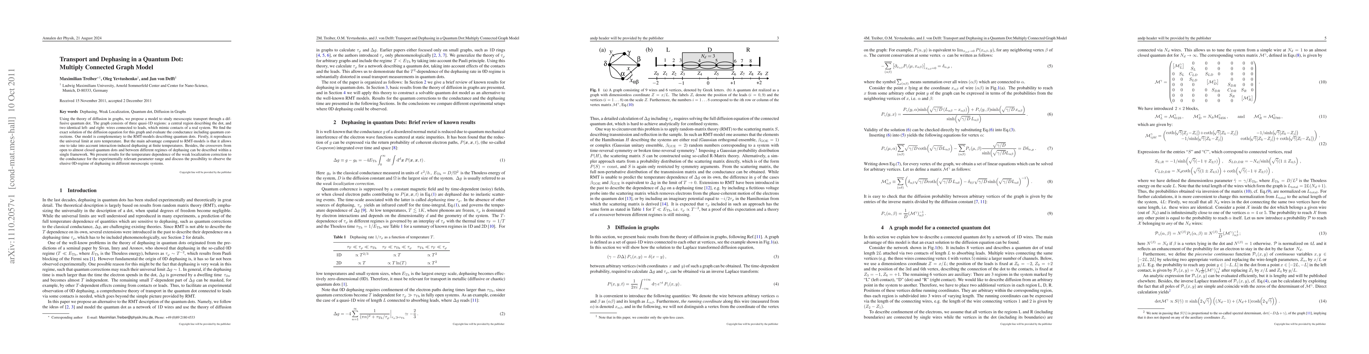 Using the theory of diffusion in graphs, we propose a model to study mesoscopic transport through a diffusive quantum dot. The graph consists of three quasi-1D regions: a central region describing the dot, and two identical left- and right- wires connected to leads, which mimic contacts of a real system. We find the exact solution of the diffusion equation for this graph and evaluate the conductance including quantum corrections. Our model is complementary to the RMT-models describing quantum dots. Firstly, it reproduces the universal limit at zero temperature. But the main advantage compared to RMT-models is that it allows one to take into account interaction-induced dephasing at finite temperatures. Besides, the crossovers from open to almost closed quantum dots and between different regimes of dephasing can be described within a single framework. We present results for the temperature dependence of the weak localization correction to the conductance for the experimentally relevant parameter range and discuss the possibility to observe the elusive 0D-regime of dephasing in different mesoscopic systems.