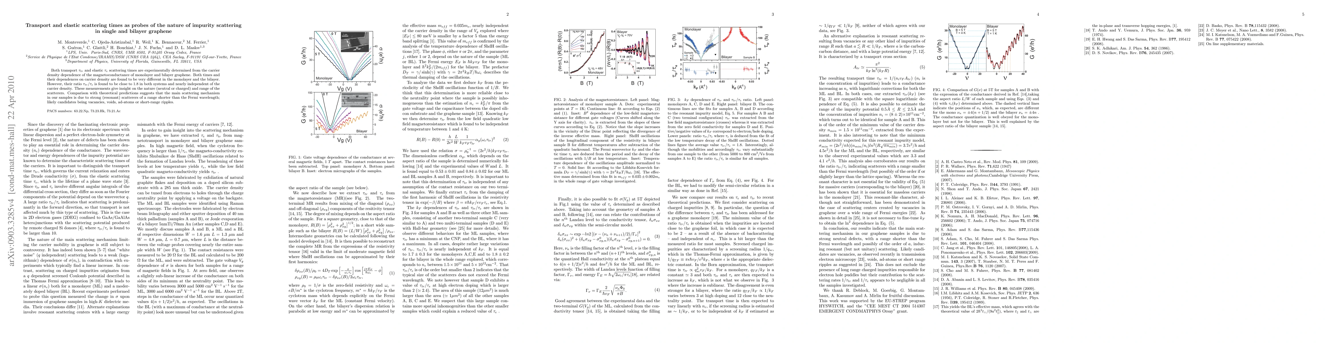 This paper investigates transport and elastic scattering times in monolayer and bilayer graphene, finding distinct behaviors in each. Despite differences, the ratio $\tau_{tr}/\tau_{e}$ remains constant, suggesting a common scattering mechanism, likely due to short-range scatterers like vacancies.