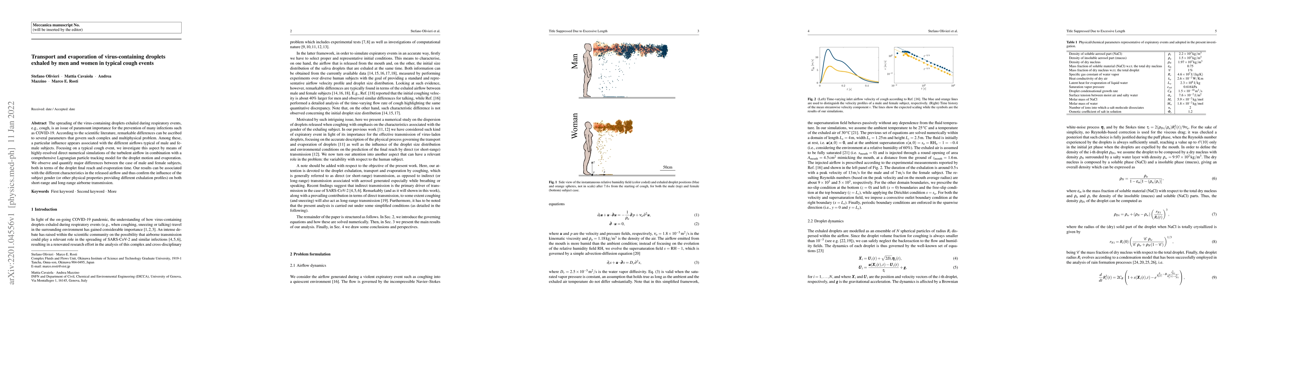 The spreading of the virus-containing droplets exhaled during respiratory events, e.g., cough, is an issue of paramount importance for the prevention of many infections such as COVID-19. According to the scientific literature, remarkable differences can be ascribed to several parameters that govern such complex and multiphysical problem. Among these, a particular influence appears associated with the different airflows typical of male and female subjects. Focusing on a typical cough event, we investigate this aspect by means of highly-resolved direct numerical simulations of the turbulent airflow in combination with a comprehensive Lagrangian particle tracking model for the droplet motion and evaporation. We observe and quantify major differences between the case of male and female subjects, both in terms of the droplet final reach and evaporation time. Our results can be associated with the different characteristics in the released airflow and thus confirm the influence of the subject gender (or other physical properties providing different exhalation profiles) on both short-range and long-range airborne transmission.
