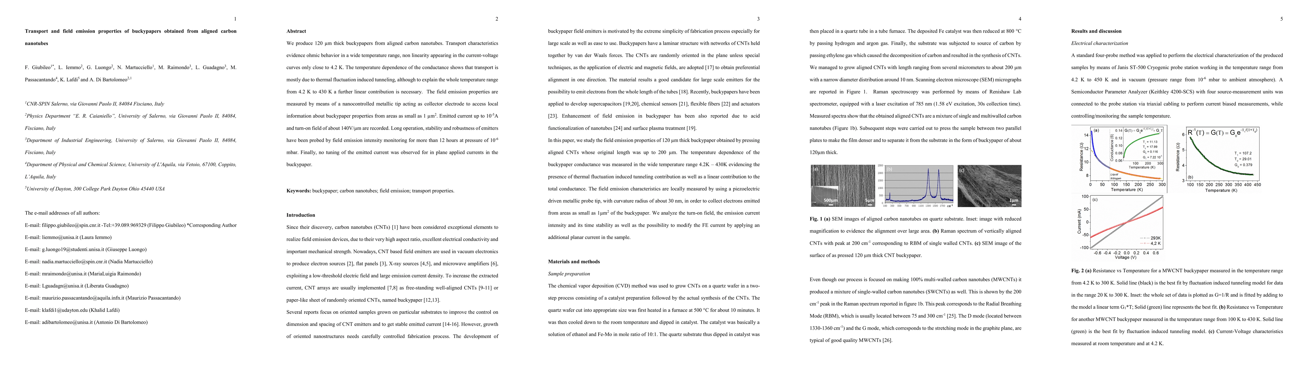 We produce 120 um thick buckypapers from aligned carbon nanotubes. Transport characteristics evidence ohmic behavior in a wide temperature range, non linearity appearing in the current-voltage curves only close to 4.2 K. The temperature dependence of the conductance shows that transport is mostly due to thermal fluctuation induced tunneling, although to explain the whole temperature range from 4.2 K to 430 K a further linear contribution is necessary. The field emission properties are measured by means of a nanocontrolled metallic tip acting as collector electrode to access local information about buckypaper properties from areas as small as 1 um2. Emitted current up to 10-5A and turn-on field of about 140V/um are recorded. Long operation, stability and robustness of emitters have been probed by field emission intensity monitoring for more than 12 hours at pressure of 10-6 mbar. Finally, no tuning of the emitted current was observed for in plane applied currents in the buckypaper.