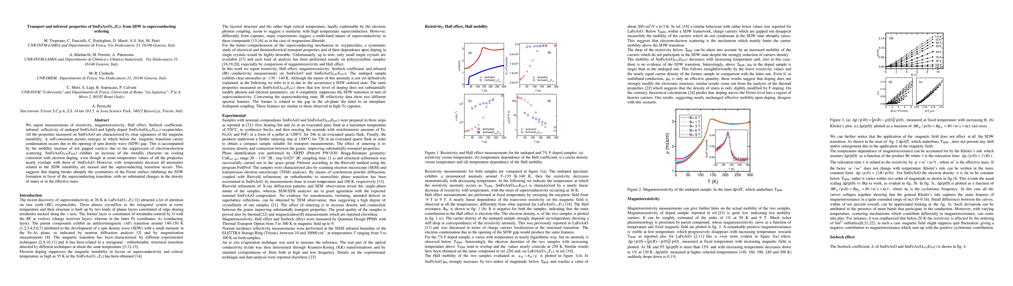We report measurements of resistivity, magnetoresistivity, Hall effect, Seebeck coefficient, infrared reflectivity of undoped SmFeAsO and lightly doped SmFeAs(O0.93F0.07) oxypnictides. All the properties measured on SmFeAsO are characterized by clear signatures of the magnetic instability. A self-consistent picture emerges in which below the magnetic transition carrier condensation occurs due to the opening of spin density wave (SDW) gap. This is accompanied by the mobility increase of not gapped carriers due to the suppression of electron-electron scattering. SmFeAs(O0.93F0.07) exhibits an increase of the metallic character on cooling consistent with electron doping, even though at room temperature values of all the properties nearly overlaps with those of SmFeAsO. However, with temperature decrease all anomalies related to the SDW instability are missed and the superconducting transition occurs. This suggests that doping breaks abruptly the symmetries of the Fermi surface inhibiting the SDW formation in favor of the superconducting transition, with no substantial changes in the density of states or in the effective mass.