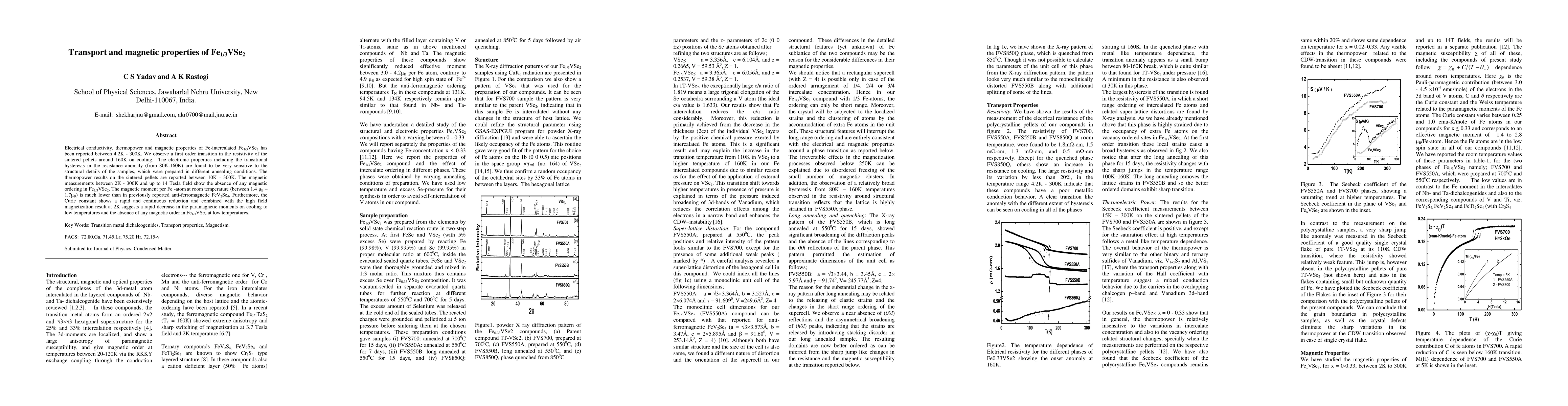 Electrical conductivity, thermopower and magnetic properties of Fe-intercalated Fe0.33VSe2 has been reported between 4.2K - 300K. We observe a first order transition in the resistivity of the sintered pellets around 160K on cooling. The electronic properties including the transitional hysteresis in the resistance anomaly (from 80K-160K) are found to be very sensitive to the structural details of the samples, which were prepared in different annealing conditions. The thermopower results on the sintered pellets are reported between 10K - 300K. The magnetic measurements between 2K - 300K and up to 14 Tesla field show the absence of any magnetic ordering in Fe0.33VSe2. The magnetic moment per Fe -atom at room temperature (between 1.4 to 1.7 Bohr Magneton) is much lower than in previously reported anti-ferromagnetic FeV2Se4. Furthermore, the Curie constant shows a rapid and continuous reduction and combined with the high field magnetization result at 2K suggests a rapid decrease in the paramagnetic moments on cooling to low temperatures and the absence of any magnetic order in Fe0.33VSe2 at low temperatures.