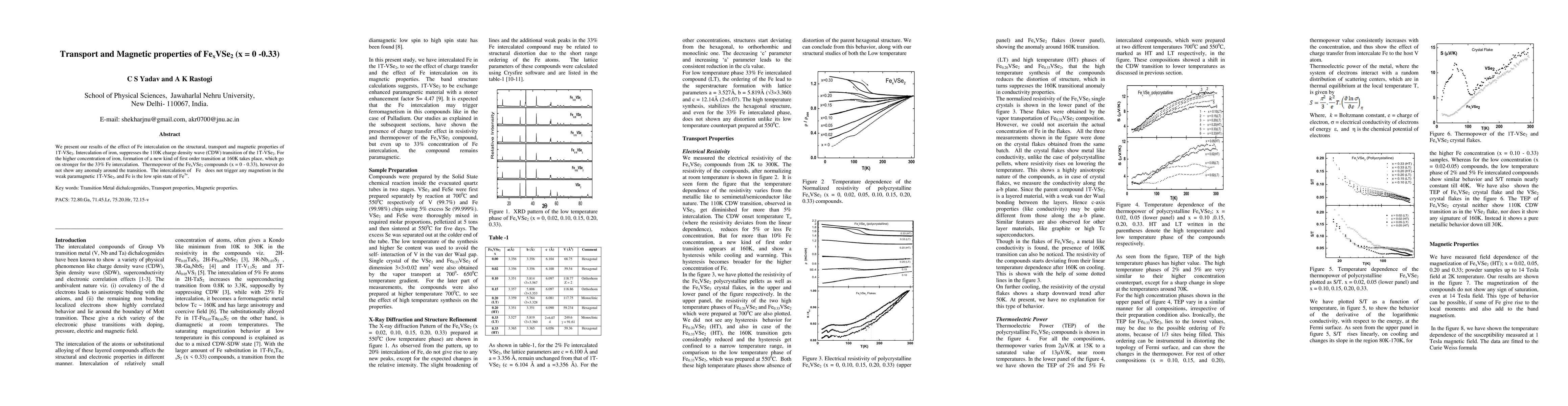 Compounds FexVSe2 (x = 0 - 0.33) were prepared via solid-state chemical reaction inside evacuated quartz tubes at 5500C (low temperature) and 7000C (high temperature). Structural characterization was done using X-ray diffraction, and transport properties were measured through electrical resistivity and thermopower. Magnetic properties were studied via field-dependent magnetization and temperature-dependent susceptibility measurements.