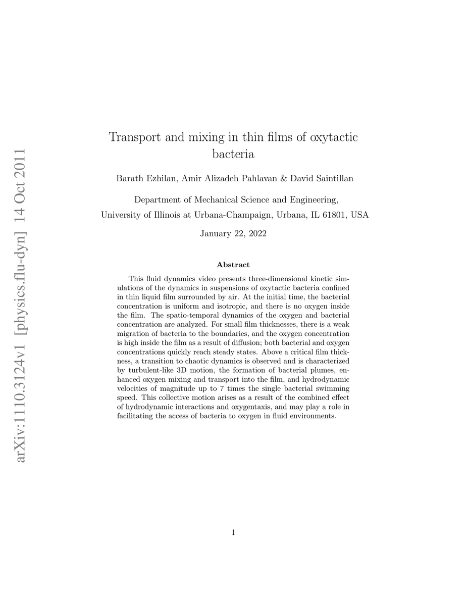 This fluid dynamics video presents three-dimensional kinetic simulations of the dynamics in suspensions of oxytactic bacteria confined in thin liquid film surrounded by air. At the initial time, the bacterial concentration is uniform and isotropic, and there is no oxygen inside the film. The spatio-temporal dynamics of the oxygen and bacterial concentration are analyzed. For small film thicknesses, there is a weak migration of bacteria to the boundaries, and the oxygen concentration is high inside the film as a result of diffusion; both bacterial and oxygen concentrations quickly reach steady states. Above a critical film thickness, a transition to chaotic dynamics is observed and is characterized by turbulent-like 3D motion, the formation of bacterial plumes, enhanced oxygen mixing and transport into the film, and hydrodynamic velocities of magnitude up to 7 times the single bacterial swimming speed. This collective motion arises as a result of the combined effect of hydrodynamic interactions and oxygentaxis, and may play a role in facilitating the access of bacteria to oxygen in fluid environments.