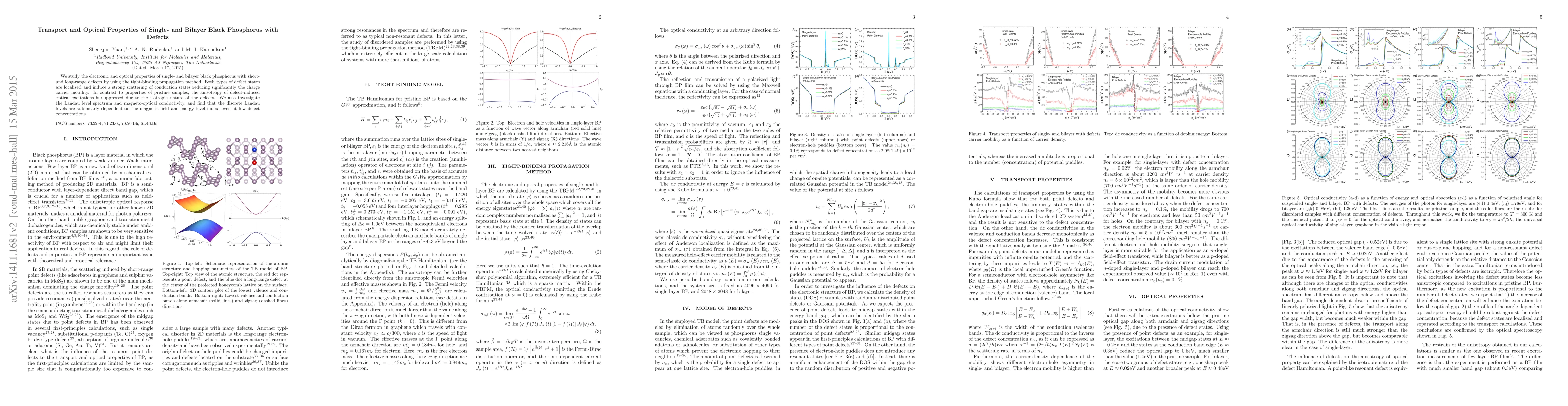 This study explores the electronic and optical properties of defective single- and bilayer black phosphorus, revealing that localized defects reduce charge carrier mobility and suppress the anisotropy of defect-induced optical excitations. Additionally, it finds that the Landau levels exhibit sublinear dependence on magnetic field and energy index, even with low defect concentrations.