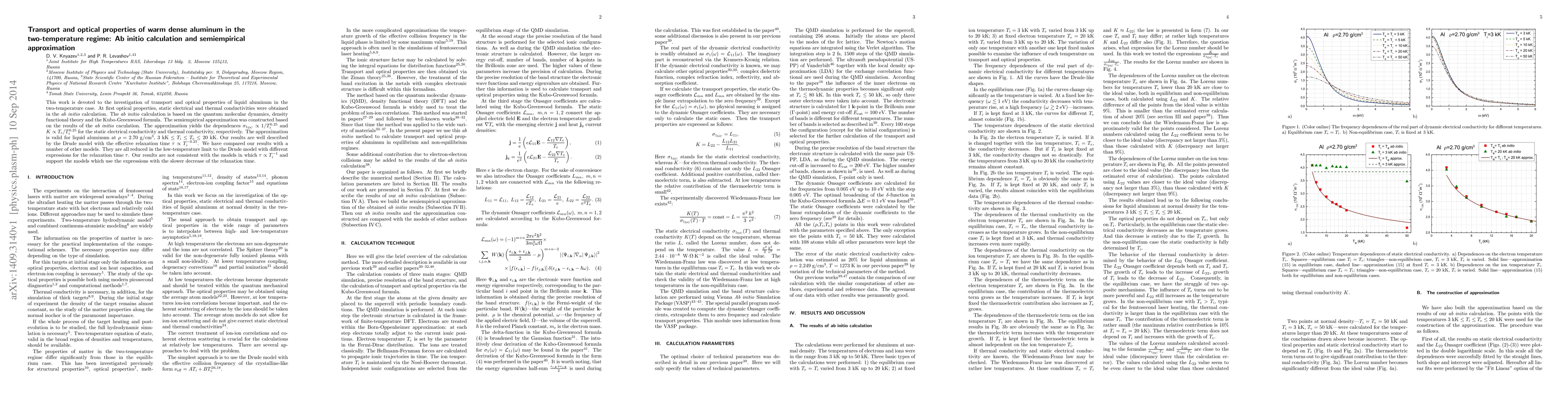 This work is devoted to the investigation of transport and optical properties of liquid aluminum in the two-temperature case. At first optical properties, static electrical and thermal conductivities were obtained in the \textit{ab initio} calculation. The \textit{ab initio} calculation is based on the quantum molecular dynamics, density functional theory and the Kubo-Greenwood formula. The semiempirical approximation was constructed based on the results of the \textit{ab initio} caculation. The approximation yields the dependences $\sigma_{1_\mathrm{DC}}\propto1/T_i^{0.25}$ and $K\propto T_e/T_i^{0.25}$ for the static electrical conductivity and thermal conductivity, respectively. The approximation is valid for liquid aluminum at $\rho=2.70$~g/cm$^3$, 3~kK~$\leq T_i\leq T_e\leq20$~kK. Our results are well described by the Drude model with the effective relaxation time $\tau\propto T_i^{-0.25}$. We have compared our results with a number of other models. They are all reduced in the low-temperature limit to the Drude model with different expressions for the relaxation time $\tau$. Our results are not consistent with the models in which $\tau\propto T_i^{-1}$ and support the models which use the expressions with the slower decrease of the relaxation time.