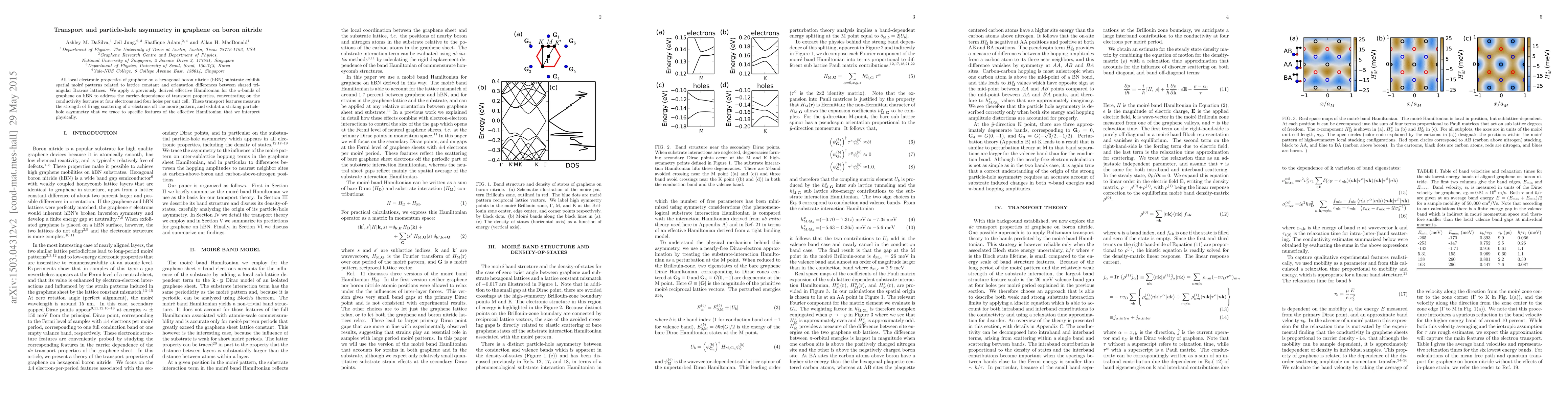 This paper investigates the transport properties of graphene on hexagonal boron nitride, revealing moiré patterns that affect carrier-dependent conductivity. It finds a notable particle-hole asymmetry in the conductivity features at four electrons and four holes per unit cell, attributing this to specific characteristics of the effective Hamiltonian governing the π-bands.