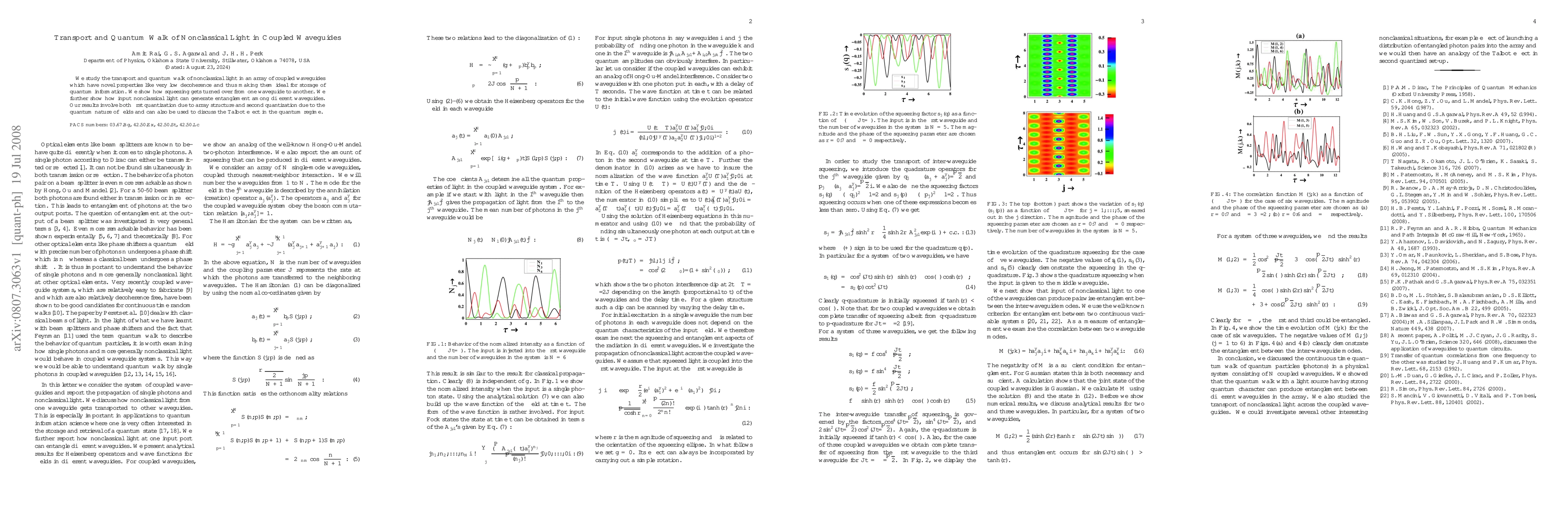 This paper investigates the transport and quantum walk of nonclassical light in coupled waveguide arrays, demonstrating low decoherence for quantum information storage. It reveals the transfer of squeezing between waveguides and the generation of entanglement, combining first and second quantization principles and discussing the Talbot effect in quantum terms.