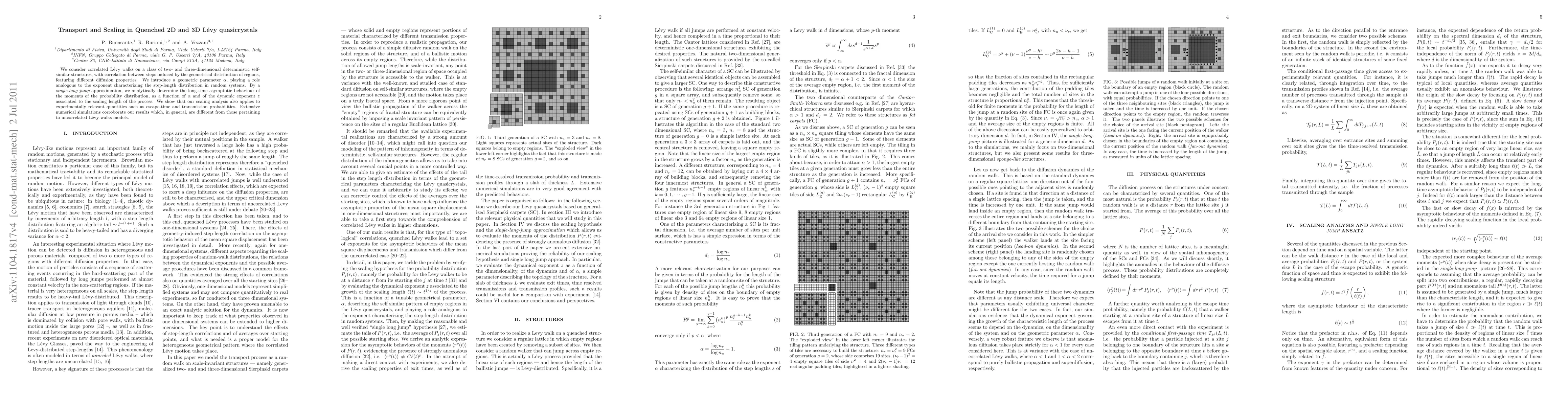 This paper investigates the transport and scaling properties of correlated Lévy walks in two- and three-dimensional quasicrystals, introducing a geometric parameter $\alpha$ to characterize the step-length distribution. Analytical and numerical results reveal distinct scaling behaviors compared to uncorrelated Lévy-walk models, with implications for escape-time and transmission probabilities.