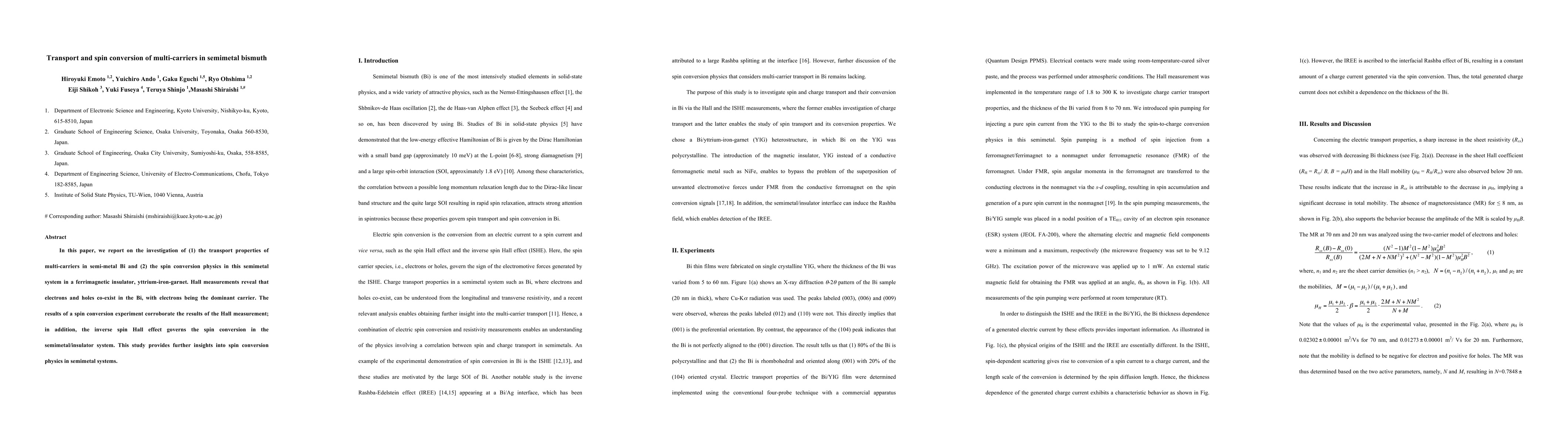 Researchers investigate transport properties of electrons and holes in semimetal bismuth and observe spin conversion governed by the inverse spin Hall effect in a ferrimagnetic insulator.