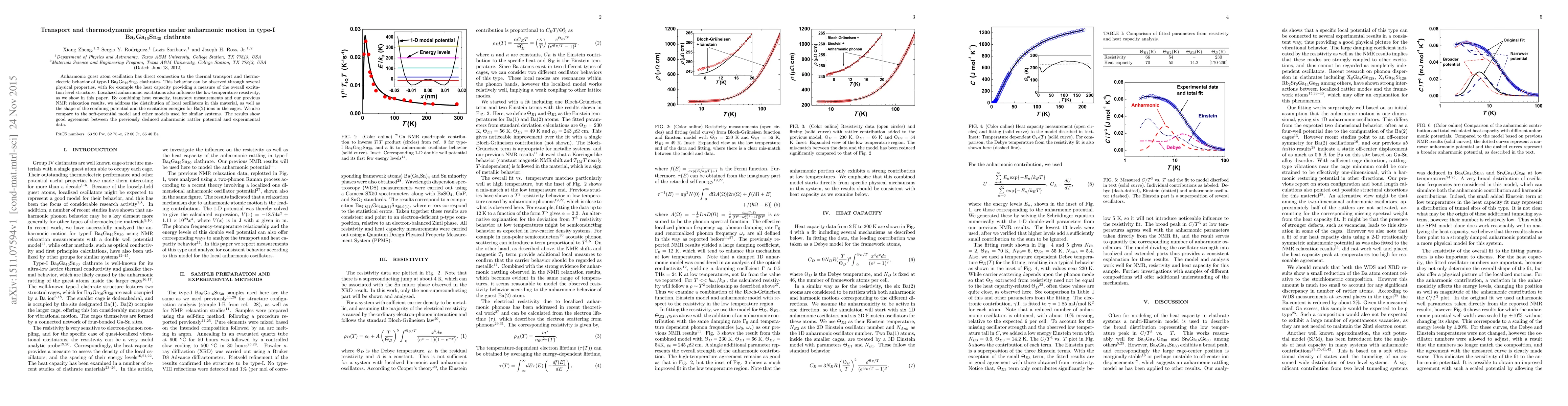 Anharmonic guest atom oscillation has direct connection to the thermal transport and thermo- electric behavior of type-I Ba8Ga16Sn30 clathrates. This behavior can be observed through several physical properties, with for example the heat capacity providing a measure of the overall excita- tion level structure. Localized anharmonic excitations also influence the low-temperature resistivity, as we show in this paper. By combining heat capacity, transport measurements and our previous NMR relaxation results, we address the distribution of local oscillators in this material, as well as the shape of the confining potential and the excitation energies for Ba(2) ions in the cages. We also compare to the soft-potential model and other models used for similar systems. The results show good agreement between the previously deduced anharmonic rattler potential and experimental data.