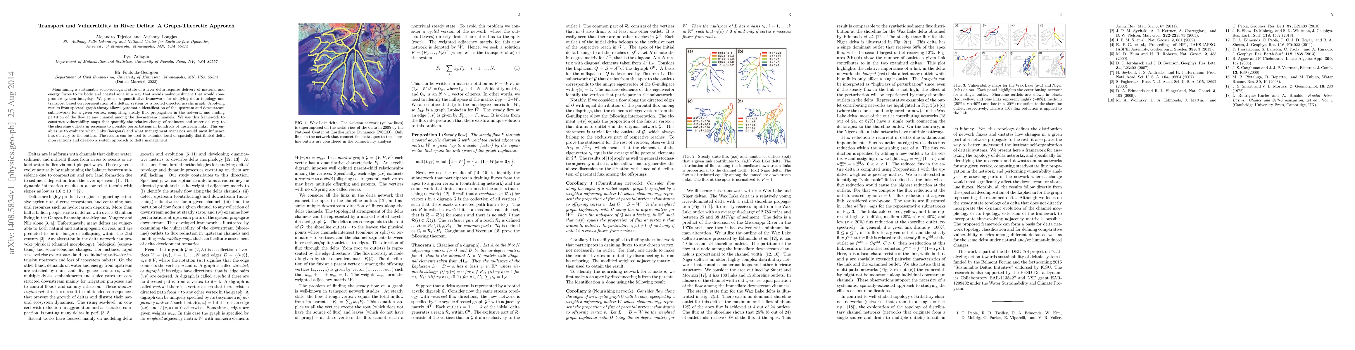 This paper introduces a graph-theoretic framework to analyze the transport and vulnerability of river deltas, utilizing spectral graph theory to identify critical upstream and downstream subnetworks and compute steady flux propagation. The framework enables the creation of vulnerability maps to assess the impact of perturbations on sediment and water delivery, aiding in the development of effective delta management strategies.