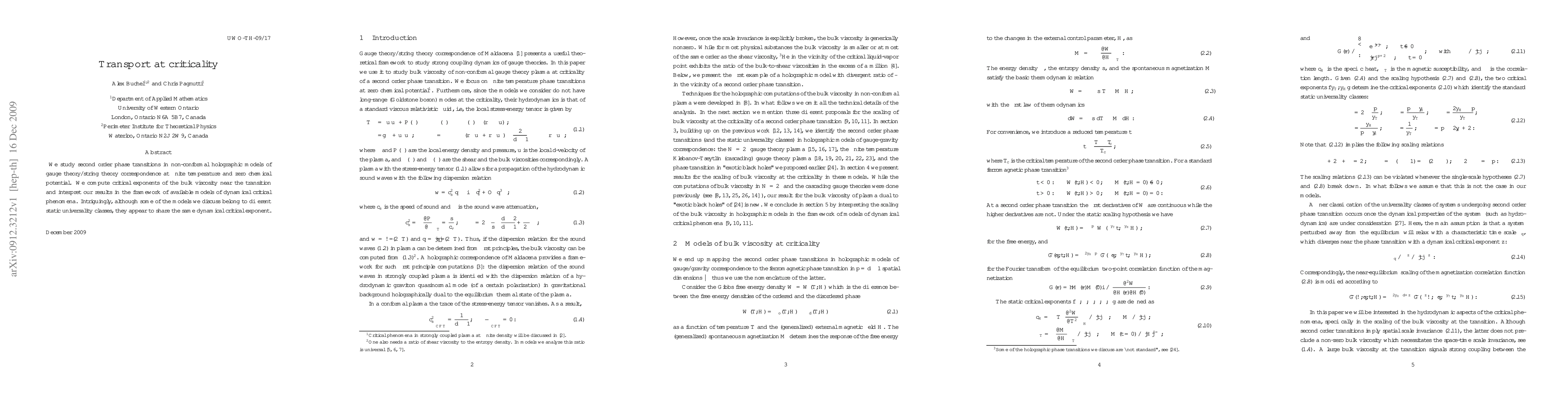 We study second order phase transitions in non-conformal holographic models of gauge theory/string theory correspondence at finite temperature and zero chemical potential. We compute critical exponents of the bulk viscosity near the transition and interpret our results in the framework of available models of dynamical critical phenomena. Intriguingly, although some of the models we discuss belong to different static universality classes, they appear to share the same dynamical critical exponent.