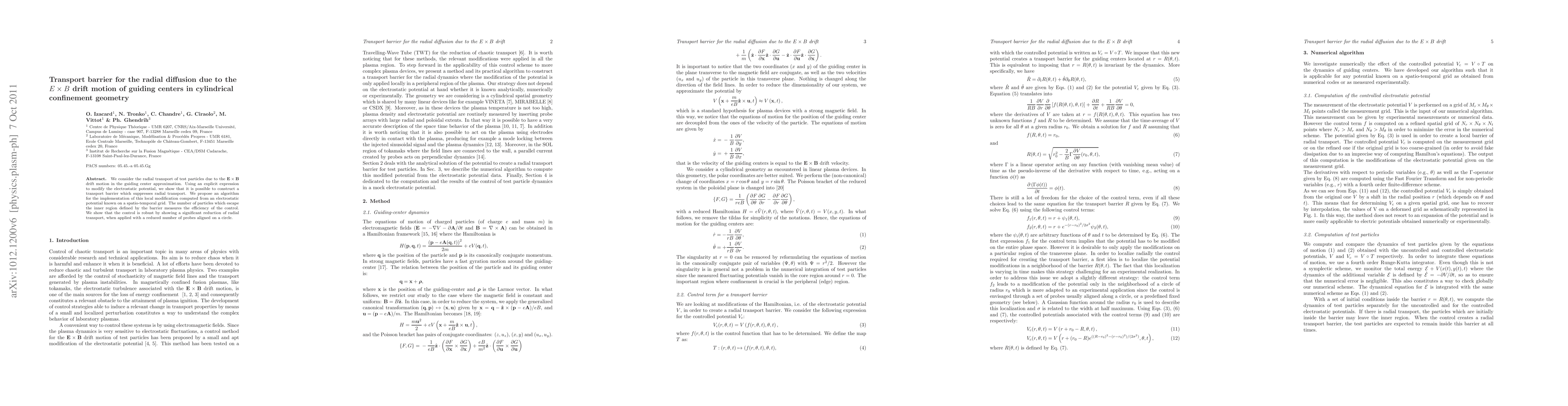 We consider the radial transport of test particles due to the ExB drift motion in the guiding center approximation. Using an explicit expression to modify the electrostatic potential, we show that it is possible to construct a transport barrier which suppresses radial transport. We propose an algorithm for the implementation of this local modification computed from an electrostatic potential known on a spatio-temporal grid. The number of particles which escape the inner region defined by the barrier measures the efficiency of the control. We show that the control is robust by showing a significant reduction of radial transport, when applied with a reduced number of probes aligned on a circle.
