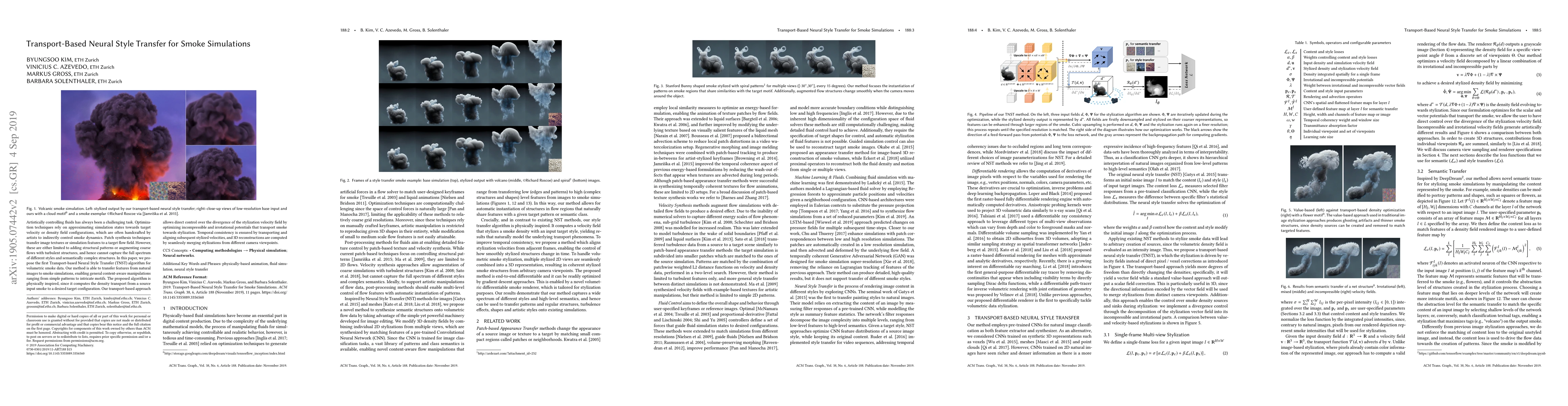 This paper introduces a Transport-based Neural Style Transfer (TNST) algorithm for volumetric smoke simulations, enabling the transfer of natural image features to smoke dynamics. The method optimizes incompressible and irrotational potentials for physically inspired density transport, ensuring temporal consistency and 3D reconstructions across different camera viewpoints.