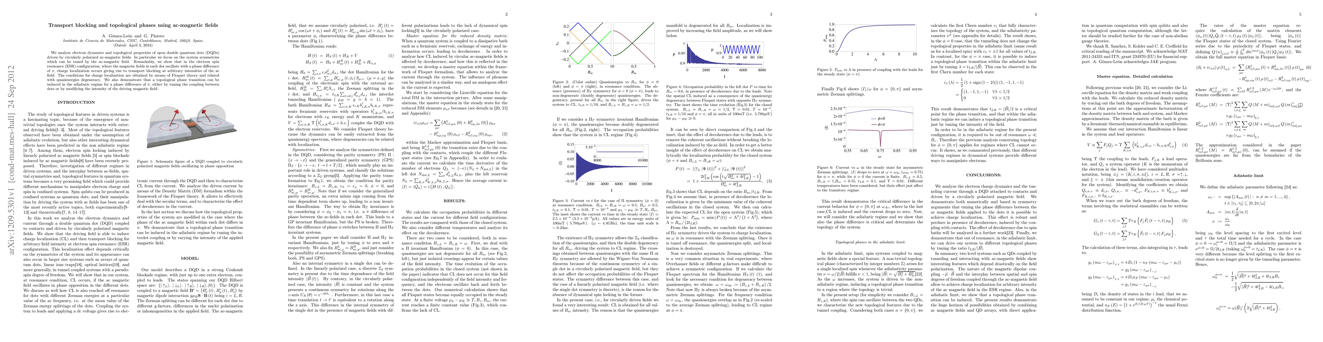 We analyze electron dynamics and topological properties of open double quantum dots (DQDs) driven by circularly polarized ac-magnetic fields. In particular we focus on the system symmetries which can be tuned by the ac-magnetic field. Remarkably, we show that in the electron spin resonance (ESR) configuration, where the magnetic fields in each dot oscillate with a phase difference of $\pi$, charge localization occurs giving rise to transport blocking at arbitrary intensities of the ac field. The conditions for charge localization are obtained by means of Floquet theory and related with quasienergies degeneracy. We also demonstrate that a topological phase transition can be induced in the adiabatic regime for a phase difference of $\pi$, either by tuning the coupling between dots or by modifying the intensity of the driving magnetic field.