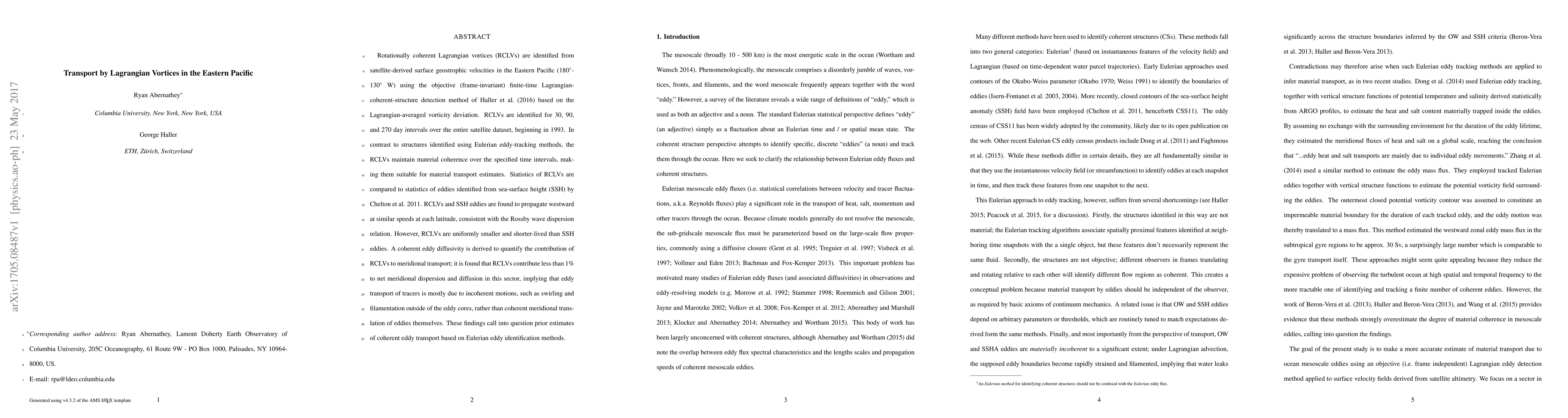 This study identifies rotationally coherent Lagrangian vortices (RCLVs) in the Eastern Pacific using satellite data and finds that they are smaller and shorter-lived than eddies identified by sea-surface height. RCLVs contribute less than 1% to meridional transport, suggesting that eddy-driven tracer transport is mainly due to incoherent motions rather than coherent eddy translation.