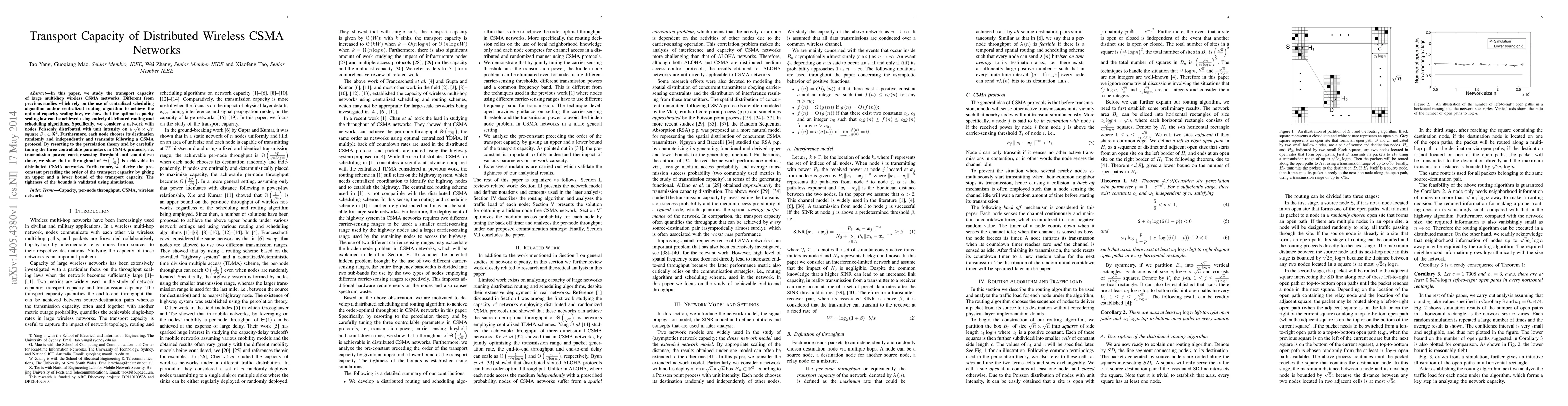 The paper presents a novel approach to achieving optimal transport capacity in distributed wireless CSMA networks through careful tuning of CSMA protocol parameters and routing algorithms.