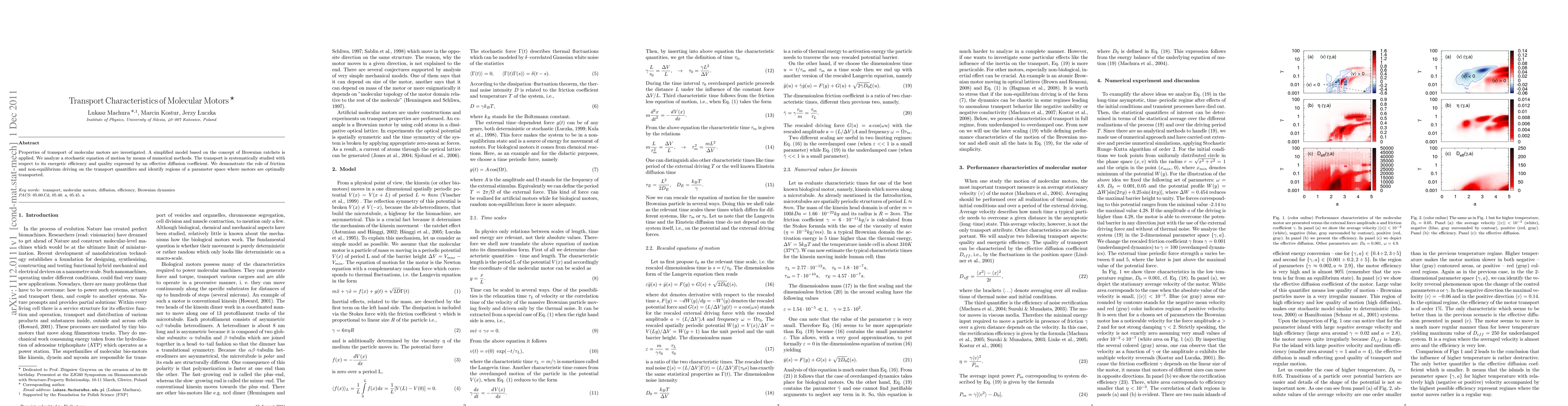 Properties of transport of molecular motors are investigated. A simplified model based on the concept of Brownian ratchets is applied. We analyze a stochastic equation of motion by means of numerical methods. The transport is systematically studied with respect to its energetic efficiency and quality expressed by an effective diffusion coefficient. We demonstrate the role of friction and non-equilibrium driving on the transport quantifiers and identify regions of a parameter space where motors are optimally transported.