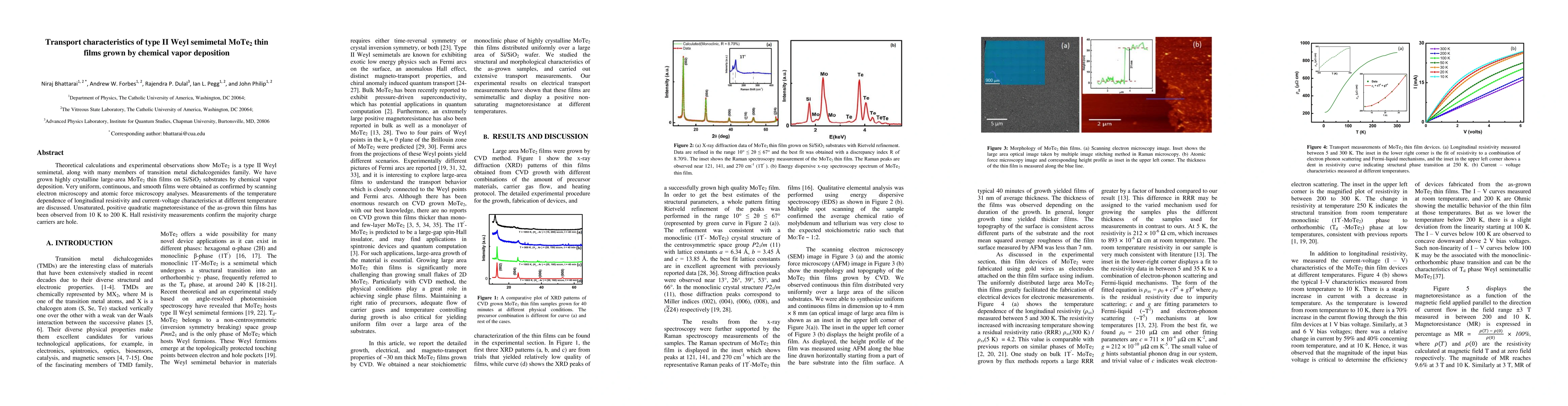Theoretical calculations and experimental observations show MoTe2 is a type II Weyl semimetal, along with many members of transition metal dichalcogenides family. We have grown highly crystalline large-area MoTe2 thin films on Si/SiO2 substrates by chemical vapor deposition. Very uniform, continuous, and smooth films were obtained as confirmed by scanning electron microscopy and atomic force microscopy analyses. Measurements of the temperature dependence of longitudinal resistivity and current-voltage characteristics at different temperature are discussed. Unsaturated, positive quadratic magnetoresistance of the as-grown thin films has been observed from 10 K to 200 K. Hall resistivity measurements confirm the majority charge carriers are hole.
