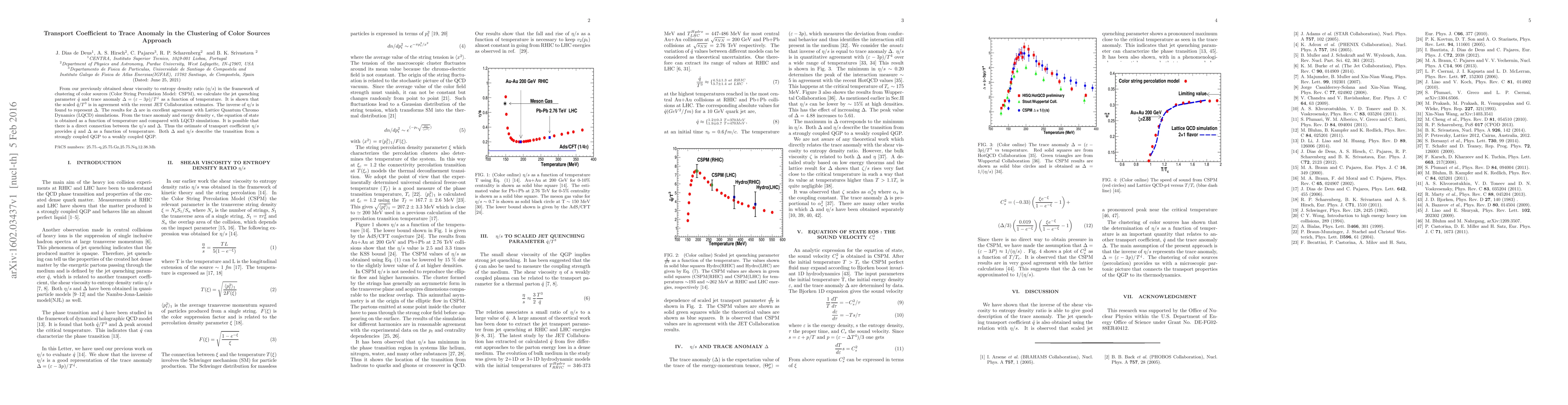 From our previously obtained shear viscosity to entropy density ratio ($\eta/s$) in the framework of clustering of color sources (Color String Percolation Model: CSPM), we calculate the jet quenching parameter $\hat {q}$ and trace anomaly $\Delta = (\varepsilon -3\it p)/T^{4}$ as a function of temperature. It is shown that the scaled $\hat {q}/T^{3}$ is in agreement with the recent JET Collaboration estimates. The inverse of $\eta/s$ is found to represent $\Delta$. The results for $\Delta$ are in excellent agreement with Lattice Quantum Chromo Dynamics (LQCD) simulations. From the trace anomaly and energy density $\epsilon$, the equation of state is obtained as a function of temperature and compared with LQCD simulations. It is possible that there is a direct connection between the $\eta/s$ and $\Delta$. Thus the estimate of transport coefficient $\eta/s$ provides $\hat {q}$ and $\Delta$ as a function of temperature. Both $\Delta$ and $\eta/s$ describe the transition from a strongly coupled QGP to a weakly coupled QGP.