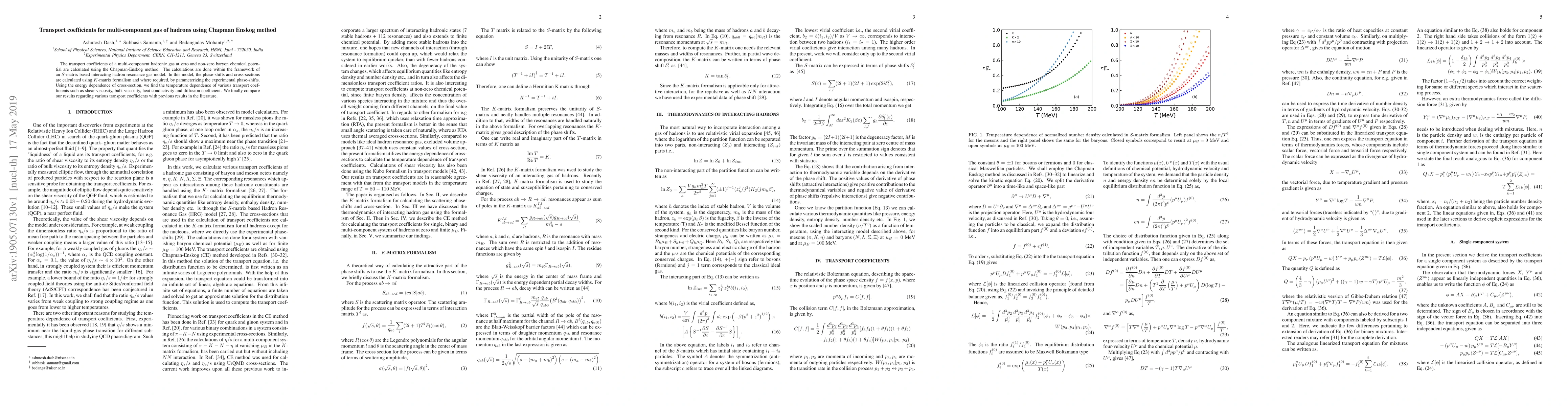 This paper calculates transport coefficients for a multi-component hadronic gas using the Chapman-Enskog method within an $S$-matrix based interacting hadron resonance gas model. It finds temperature dependencies for shear viscosity, bulk viscosity, heat conductivity, and diffusion coefficient, and compares these results with previous studies.