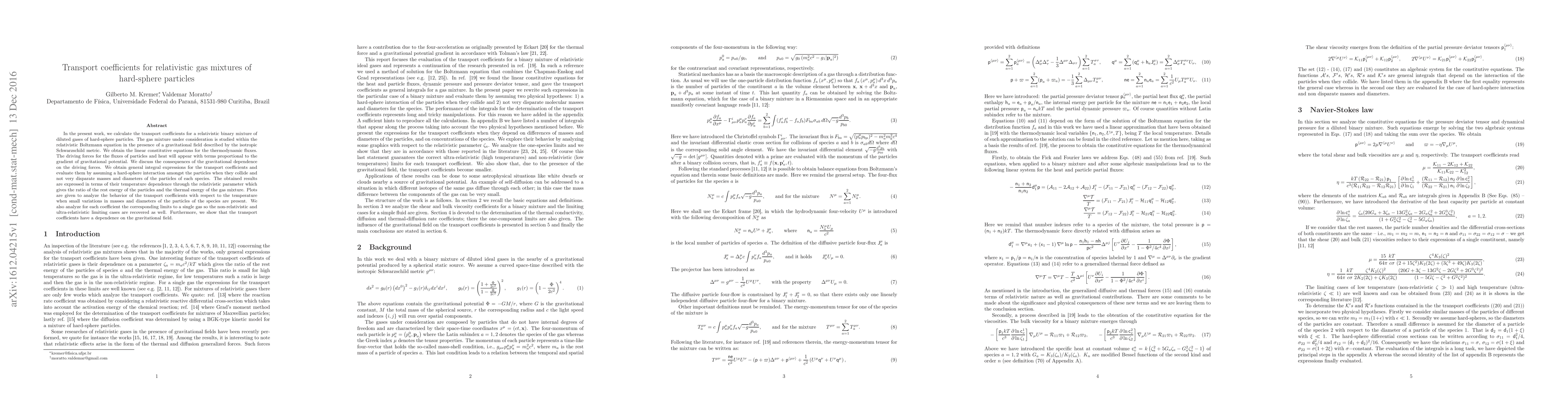 The paper calculates transport coefficients for a relativistic binary mixture of hard-sphere particles in the presence of gravity, showing that gravitational dependence affects driving forces and transport behavior.