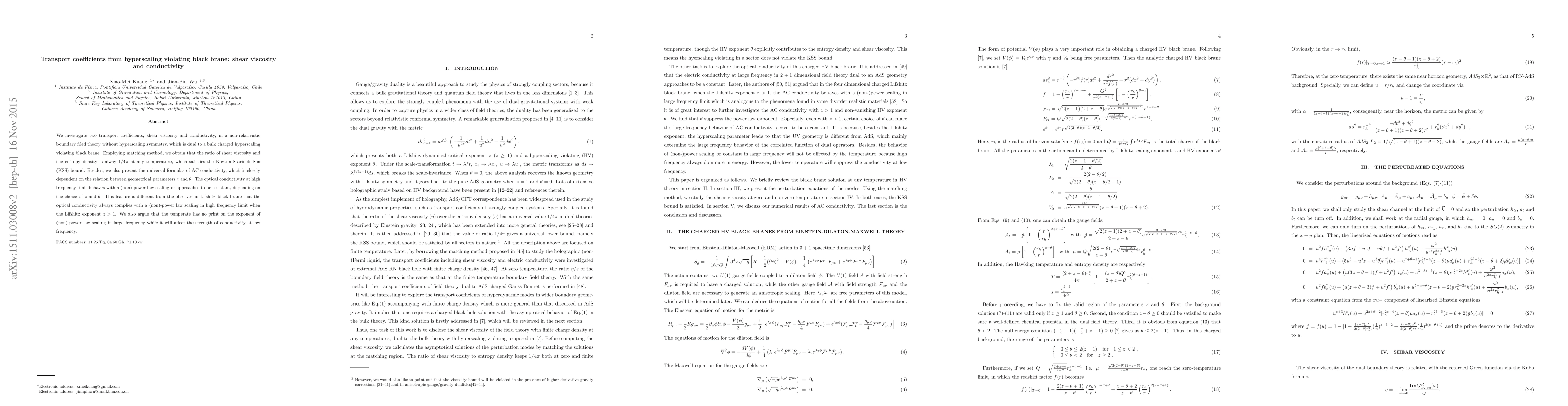 This paper investigates shear viscosity and conductivity in a non-relativistic boundary field theory without hyperscaling symmetry, dual to a charged hyperscaling violating black brane. It finds the shear viscosity to entropy density ratio is always $1/4\pi$ at any temperature, satisfying the KSS bound, and presents unique optical conductivity behaviors dependent on geometrical parameters.