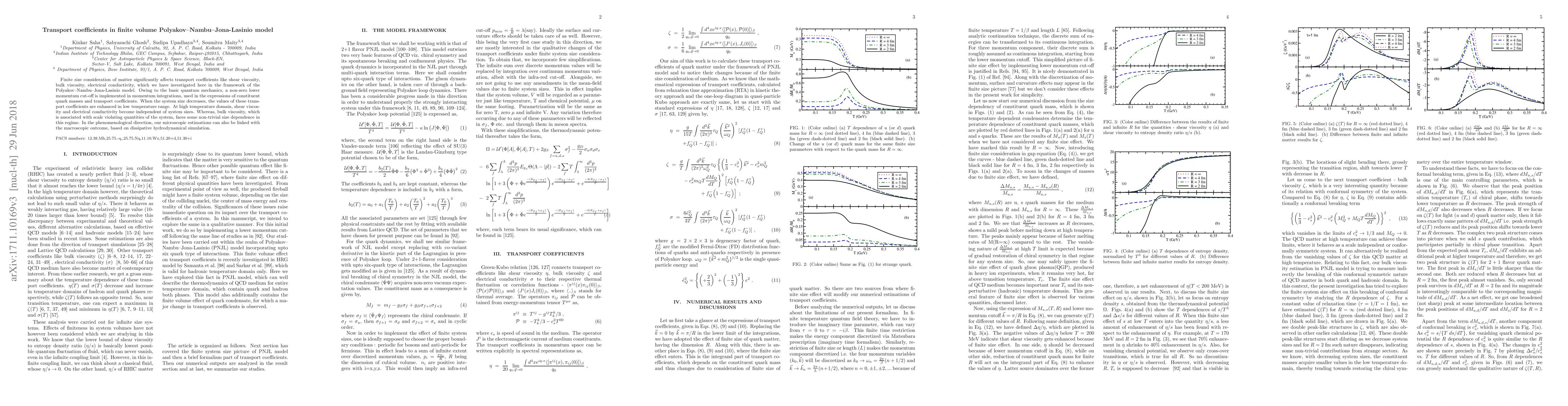 Finite size consideration of matter significantly affects transport coefficients like shear viscosity, bulk viscosity, electrical conductivity, which we have investigated here in the framework of the Polyakov-Nambu-Jona-Lasinio model. Owing to the basic quantum mechanics, a non-zero lower momentum cut-off is implemented in momentum integrations, used in the expressions of constituent quark masses and transport coefficients. When the system size decreases, the values of these trans- port coefficients are enhanced in low temperature range. At high temperature domain, shear viscos- ity and electrical conductivity become independent of system sizes. Whereas, bulk viscosity, which is associated with scale violating quantities of the system, faces some non-trivial size dependence in this regime. In the phenomenological direction, our microscopic estimations can also be linked with the macroscopic outcome, based on dissipative hydrodynamical simulation.