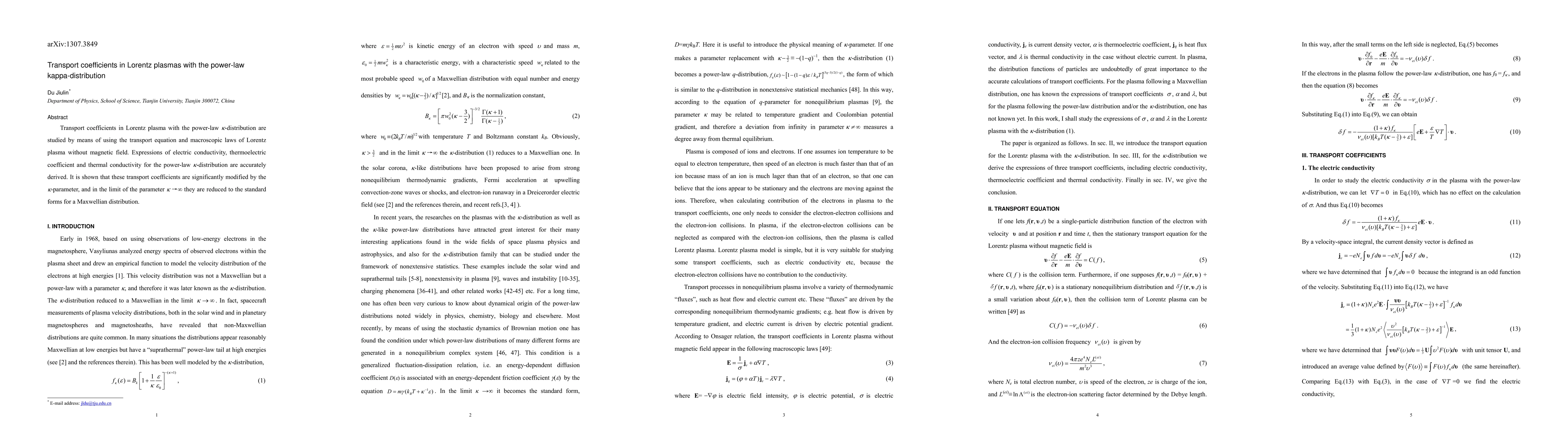This paper derives expressions for electric conductivity, thermoelectric coefficient, and thermal conductivity in Lorentz plasmas with a power-law kappa-distribution. It demonstrates that these transport coefficients are significantly influenced by the kappa-parameter, reverting to standard forms for a Maxwellian distribution as kappa approaches infinity.