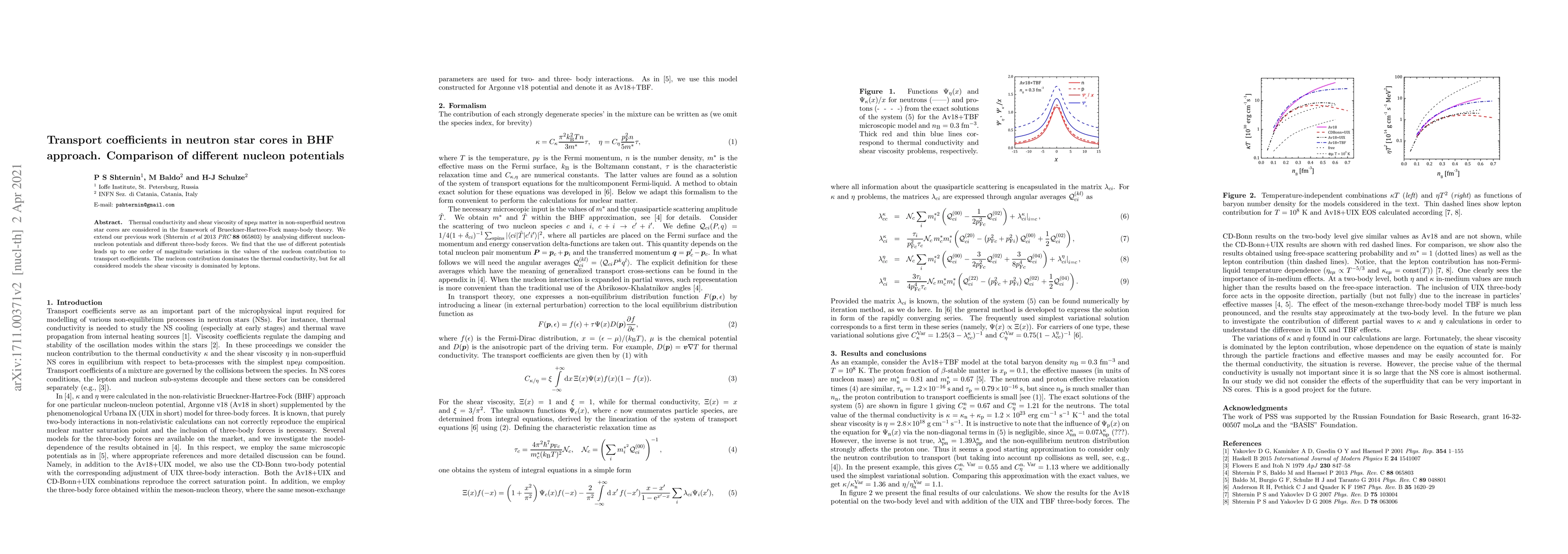 This paper investigates thermal conductivity and shear viscosity in neutron star cores using Brueckner-Hartree-Fock theory, comparing different nucleon potentials and three-body forces. It finds that varying potentials can cause up to an order of magnitude change in nucleon transport coefficients, with nucleons dominating thermal conductivity and leptons dominating shear viscosity.