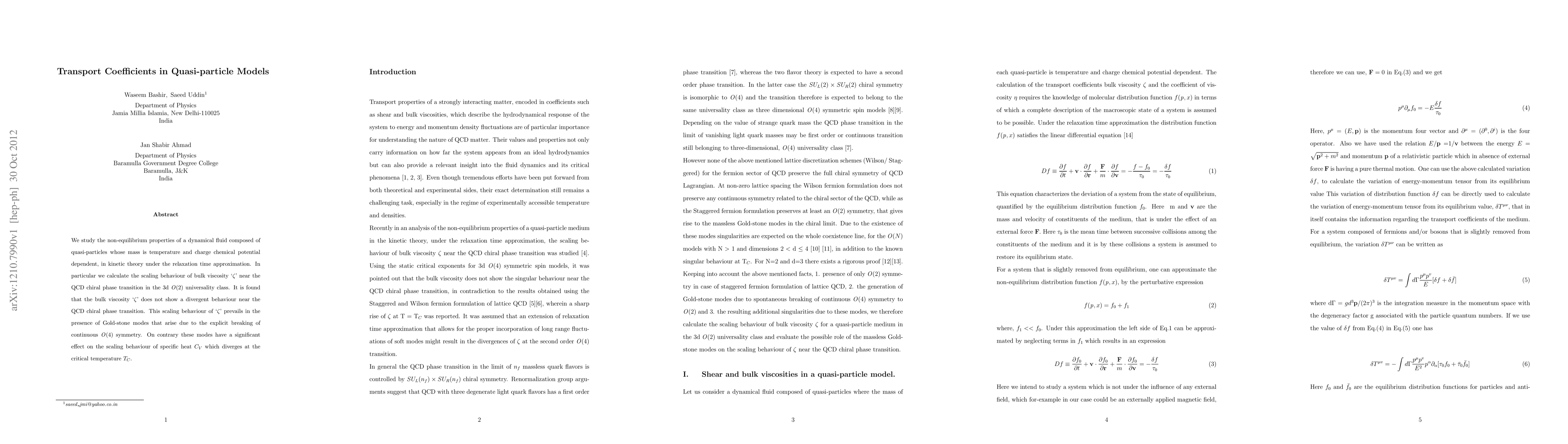 We study the non-equilibrium properties of a dynamical fluid composed of quasi-particles whose mass is temperature and charge chemical potential dependent, in kinetic theory under the relaxation time approximation. In particular we calculate the scaling behaviour of bulk viscosity `$\zeta$' near the QCD chiral phase transition in the 3d $\it O$(2) universality class. It is found that the bulk viscosity `$\zeta$' does not show a divergent behaviour near the QCD chiral phase transition. This scaling behaviour of `$\zeta$' prevails in the presence of Gold-stone modes that arise due to the explicit breaking of continuous $\it O$(4) symmetry. On contrary these modes have a significant effect on the scaling behaviour of specific heat $C_V$ which diverges at the critical temperature $T_C$.
