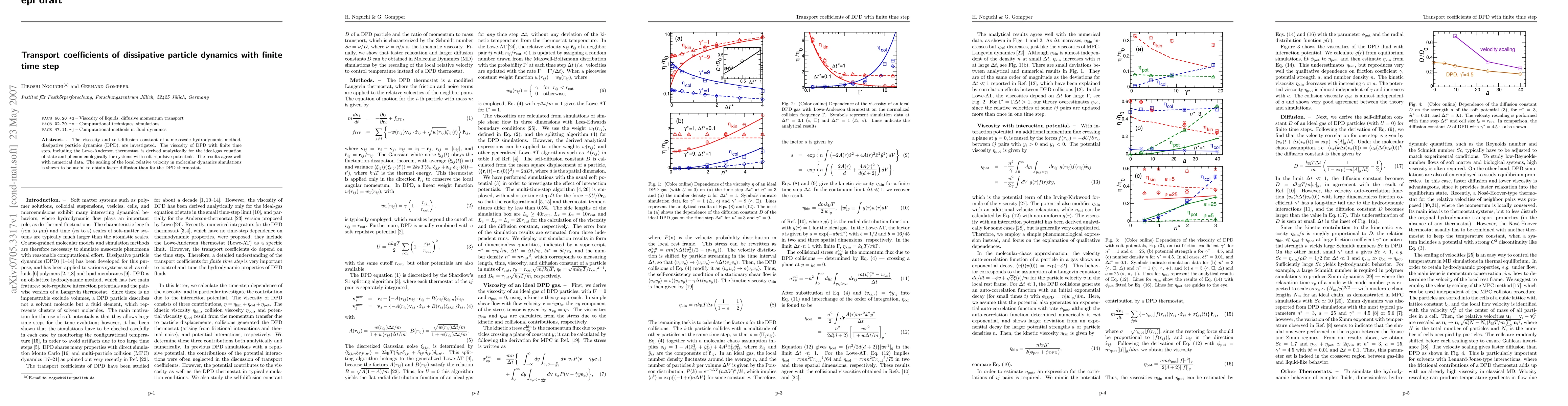The viscosity and self-diffusion constant of a mesoscale hydrodynamic method, dissipative particle dynamics (DPD), are investigated. The viscosity of DPD with finite time step, including the Lowe-Anderson thermostat, is derived analytically for the ideal-gas equation of state and phenomenologically for systems with soft repulsive potentials. The results agree well with numerical data. The scaling of the local relative velocity in molecular dynamics simulations is shown to be useful to obtain faster diffusion than for the DPD thermostat.