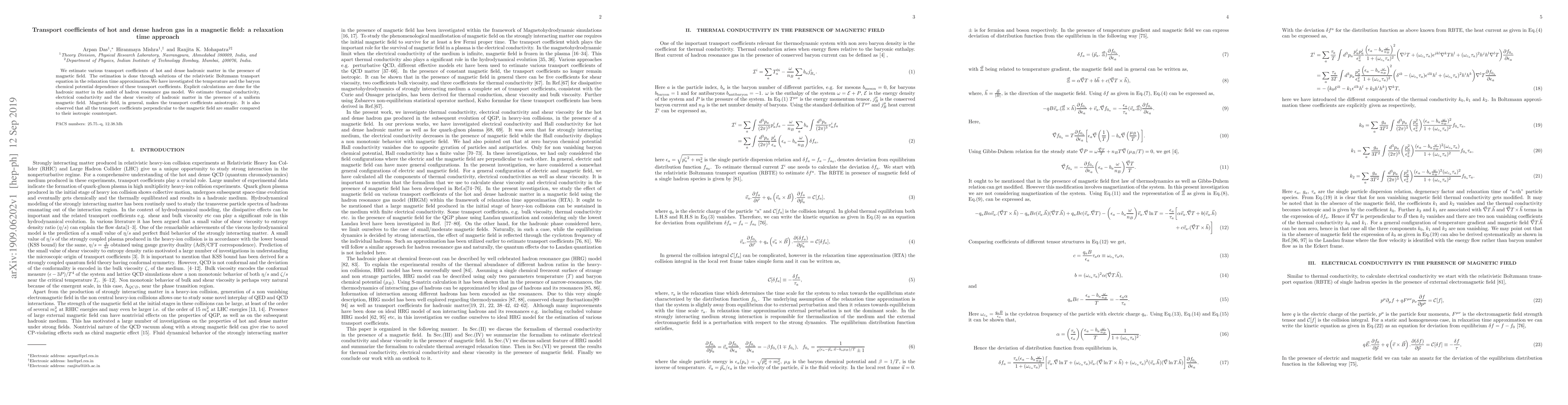 This paper estimates transport coefficients—thermal conductivity, electrical conductivity, and shear viscosity—of hot and dense hadronic matter under a magnetic field using the relativistic Boltzmann transport equation in relaxation time approximation. The study reveals that the magnetic field induces anisotropy in these coefficients, with those perpendicular to the field being smaller than their isotropic counterparts.