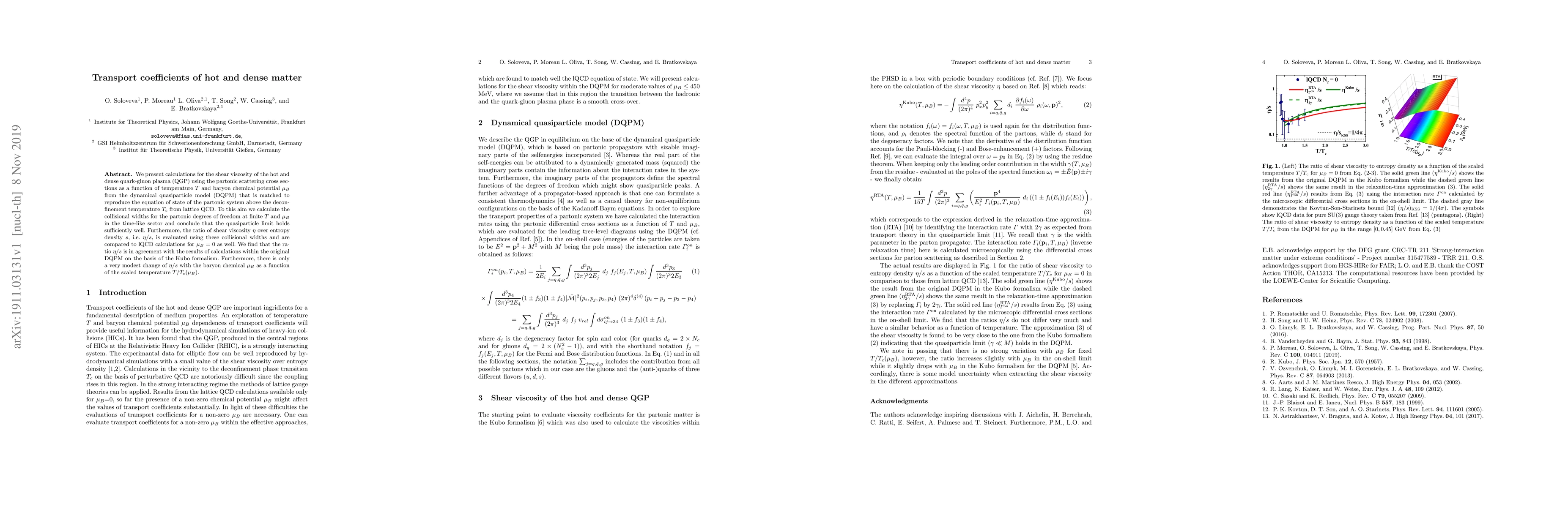 We present calculations for the shear viscosity of the hot and dense quark-gluon plasma (QGP) using the partonic scattering cross sections as a function of temperature $T$ and baryon chemical potential $\mu_B$ from the dynamical quasiparticle model (DQPM) that is matched to reproduce the equation of state of the partonic system above the deconfinement temperature $T_c$ from lattice QCD. To this aim we calculate the collisional widths for the partonic degrees of freedom at finite $T$ and $\mu_B$ in the time-like sector and conclude that the quasiparticle limit holds sufficiently well. Furthermore, the ratio of shear viscosity $\eta$ over entropy density $s$, i.e. $\eta/s$, is evaluated using these collisional widths and are compared to lQCD calculations for $\mu_B$ = 0 as well. We find that the ratio $\eta/s$ is in agreement with the results of calculations within the original DQPM on the basis of the Kubo formalism. Furthermore, there is only a very modest change of $\eta/s$ with the baryon chemical $\mu_B$ as a function of the scaled temperature $T/T_c(\mu_B)$.