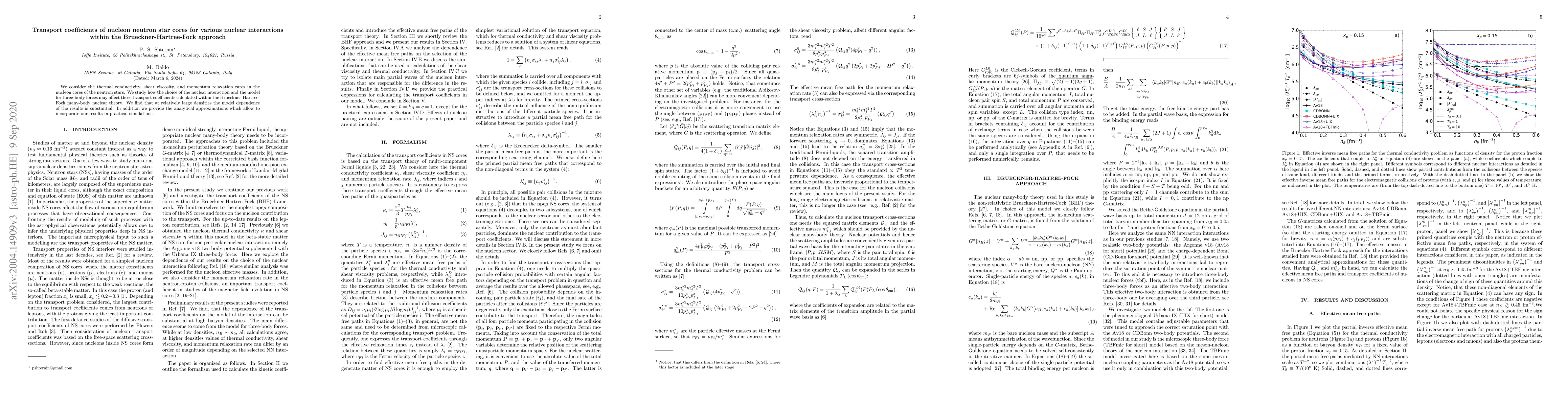 This paper investigates transport coefficients in neutron star cores using the Brueckner-Hartree-Fock approach, finding that nuclear interaction models significantly affect thermal conductivity, shear viscosity, and momentum relaxation rates, especially at high densities. Analytical approximations are also provided for practical simulations.