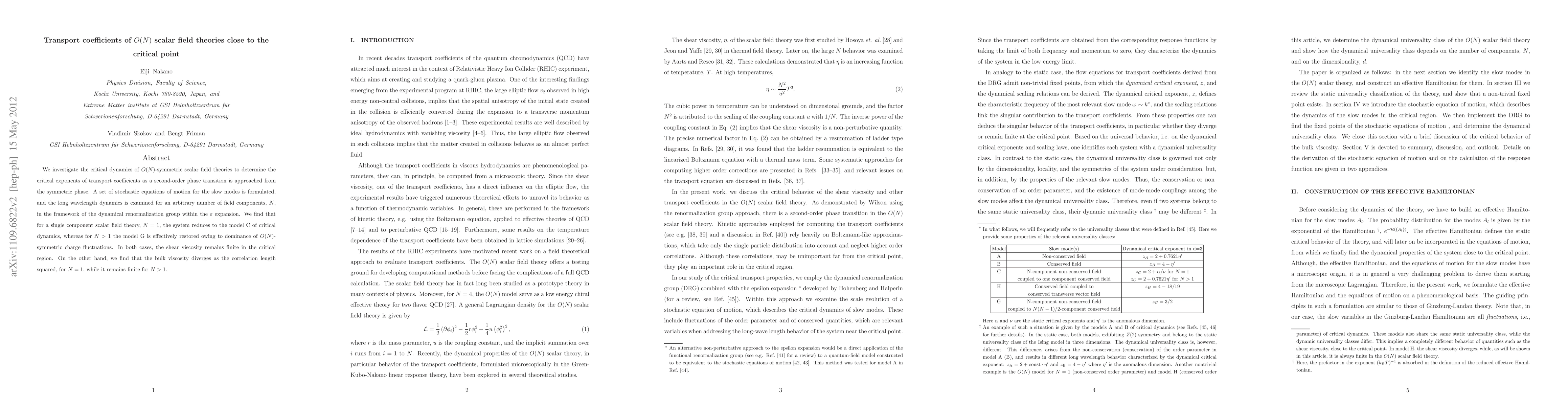 This paper investigates the critical dynamics of O(N)-symmetric scalar field theories to determine transport coefficients' critical exponents near a second-order phase transition. The study reveals that for a single component, N=1, the model C of critical dynamics applies, while for N>1, model G is restored due to O(N)-symmetric charge fluctuations, with shear viscosity finite and bulk viscosity diverging for N=1 but finite for N>1.