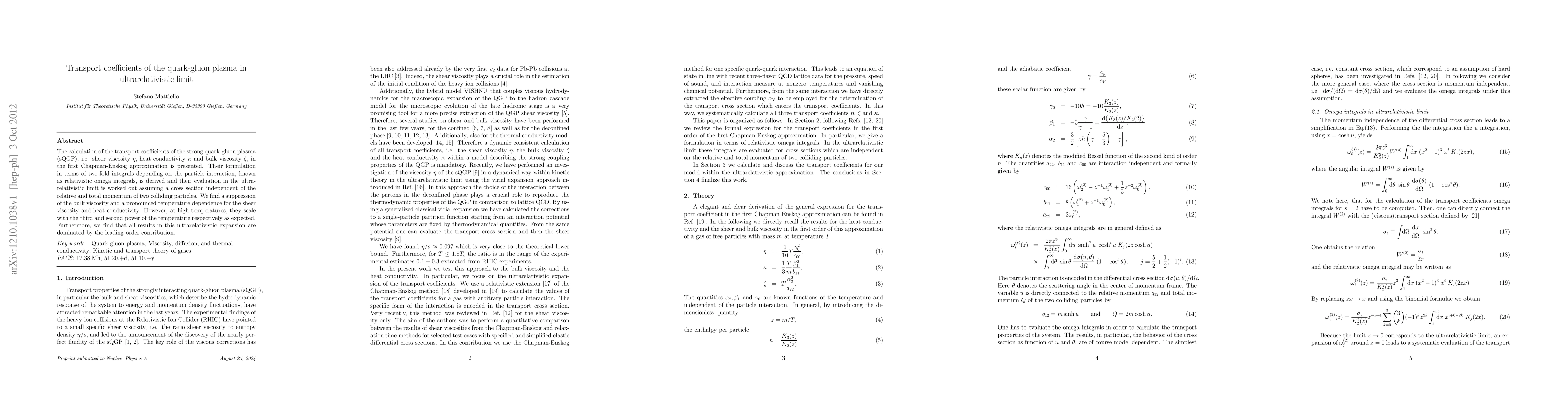 The calculation of the transport coefficients of the strong quark-gluon plasma (sQGP), i.e. sheer viscosity $\eta$, heat conductivity $\gk$ and bulk viscosity $\zeta$, in the first Chapman-Enskog approximation is presented. Their formulation in terms of two-fold integrals depending on the particle interaction, known as relativistic omega integrals, is derived and their evaluation in the ultrarelativistic limit is worked out assuming a cross section independent of the relative and total momentum of two colliding particles. We find a suppression of the bulk viscosity and a pronounced temperature dependence for the sheer viscosity and heat conductivity. However, at high temperatures, they scale with the third and second power of the temperature respectively as expected. Furthermore, we find that all results in this ultrarelativistic expansion are dominated by the leading order contribution.