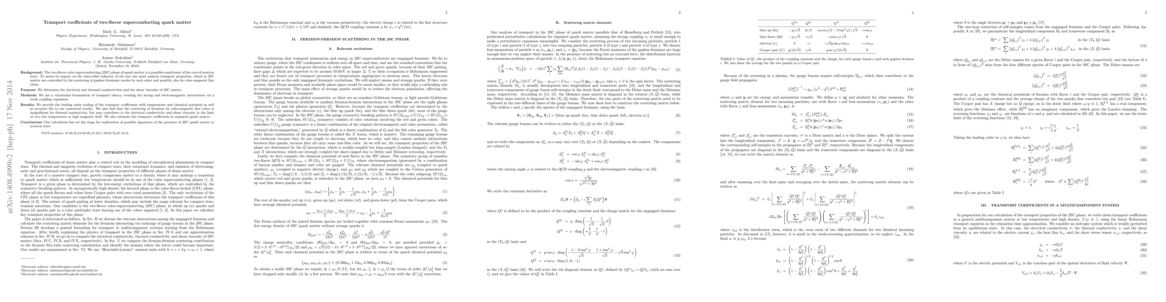 This paper determines the electrical and thermal conductivities and shear viscosity of two-flavor color superconducting quark matter (2SC), finding that scattering by color-magnetic flux tubes affects electrical conductivity and shear viscosity mainly at low temperatures or high magnetic fields. The results provide a foundation for identifying 2SC quark matter signatures in neutron stars.