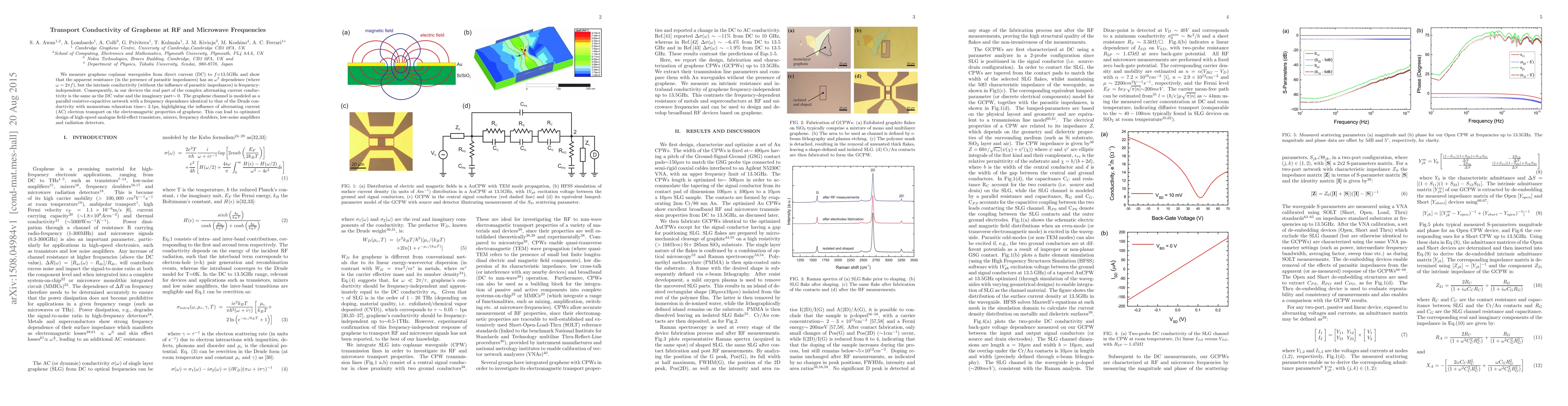 We measure graphene coplanar waveguides from direct current (DC) to 13.5GHz and show that the apparent resistance (in the presence of parasitic impedances) has an quadratic frequency dependence, but the intrinsic conductivity (without the influence of parasitic impedances) is frequency-independent. Consequently, in our devices the real part of the complex alternating current conductivity is the same as the DC value and the imaginary part~0. The graphene channel is modelled as a parallel resistive-capacitive network with a frequency dependence identical to that of the Drude conductivity with momentum relaxation time~2.1ps, highlighting the influence of alternating current (AC) electron transport on the electromagnetic properties of graphene. This can lead to optimized design of high-speed analogue field-effect transistors, mixers, frequency doublers, low-noise amplifiers and radiation detectors.