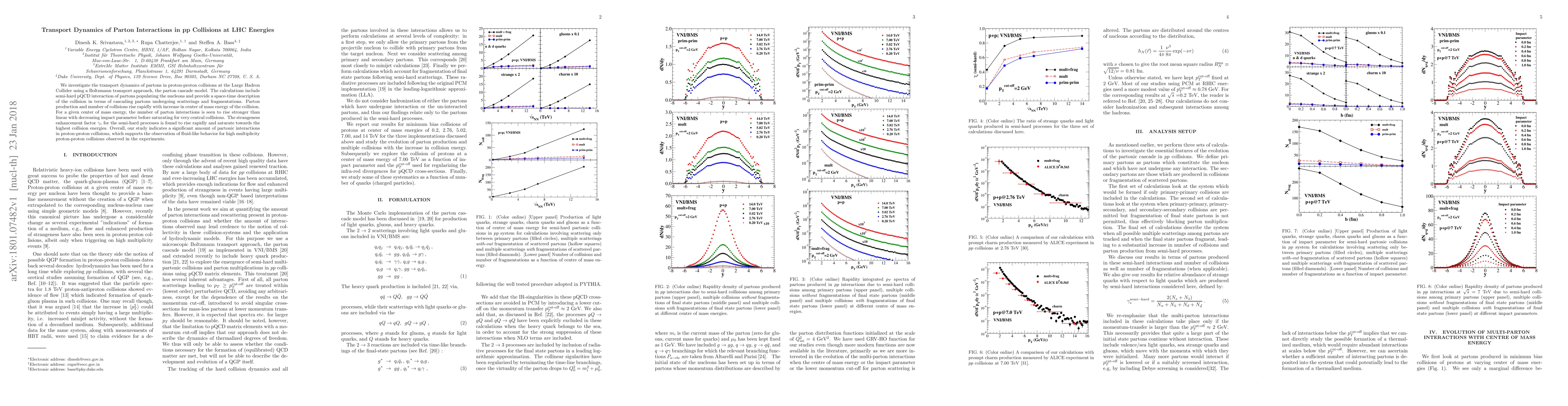 We investigate the transport dynamics of partons in proton-proton collisions at the Large Hadron Collider using a Boltzmann transport approach, the parton cascade model. The calculations include semi-hard pQCD interaction of partons populating the nucleons and provide a space-time description of the collision in terms of cascading partons undergoing scatterings and fragmentations. Parton production and number of collisions rise rapidly with increase in center of mass energy of the collision. For a given center of mass energy, the number of parton interactions is seen to rise stronger than linear with decreasing impact parameter before saturating for very central collisions. The strangeness enhance factor $\gamma_s$ for the semi-hard processes is found to rise rapidly and saturate towards the highest collision energies. Overall, our study indicates a significant amount of partonic interactions in proton-proton collisions, which supports the observation of fluid-like behavior for high multiplicity proton-proton collisions observed in the experiments.