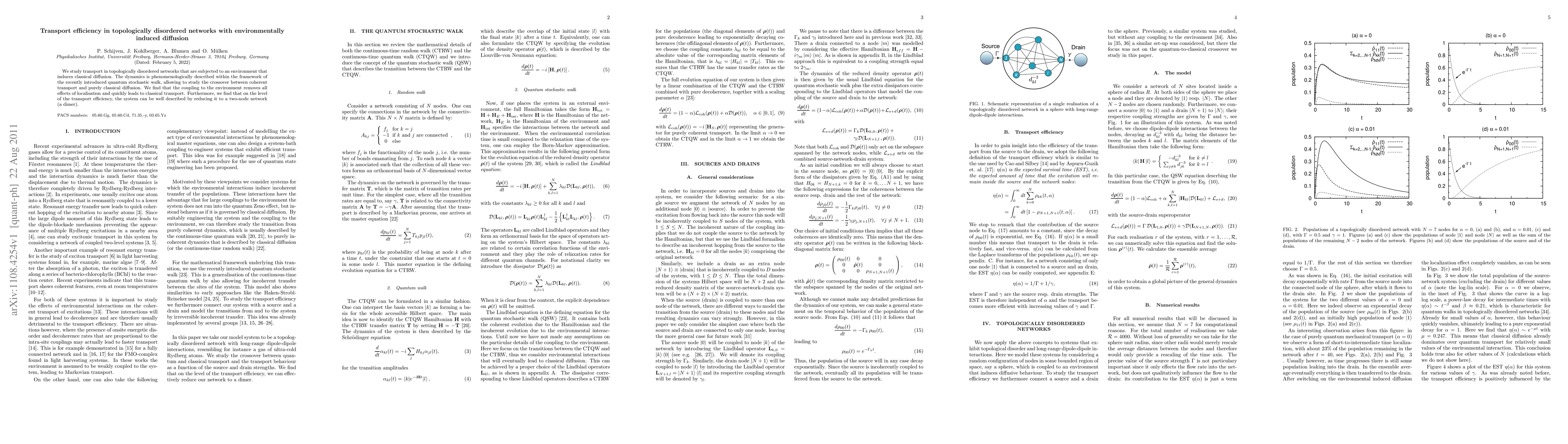 We study transport in topologically disordered networks that are subjected to an environment that induces classical diffusion. The dynamics is phenomenologically described within the framework of the recently introduced quantum stochastic walk, allowing to study the crossover between coherent transport and purely classical diffusion. We find that the coupling to the environment removes all effects of localization and quickly leads to classical transport. Furthermore, we find that on the level of the transport efficiency, the system can be well described by reducing it to a two-node network (a dimer).
