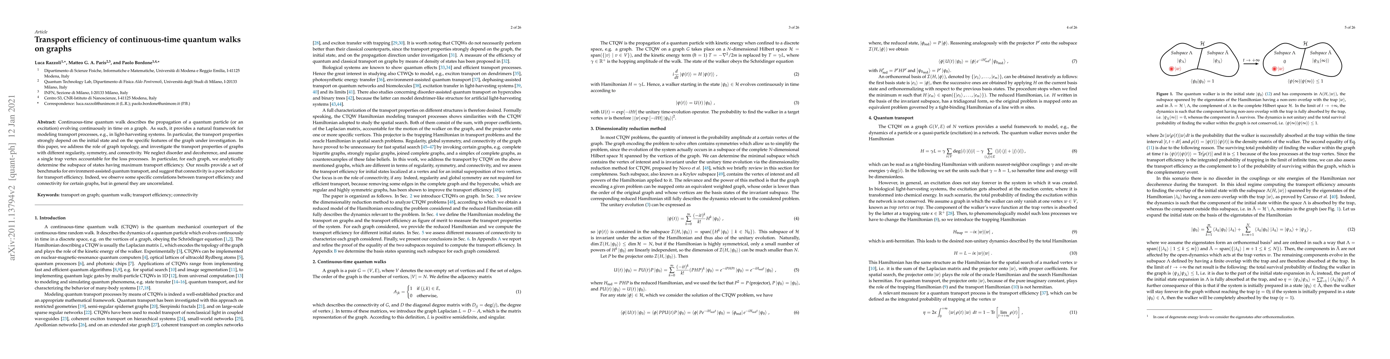 This paper investigates the transport efficiency of continuous-time quantum walks on graphs, finding that connectivity is not a reliable indicator for transport efficiency, and that certain correlations exist between transport efficiency and graph features.