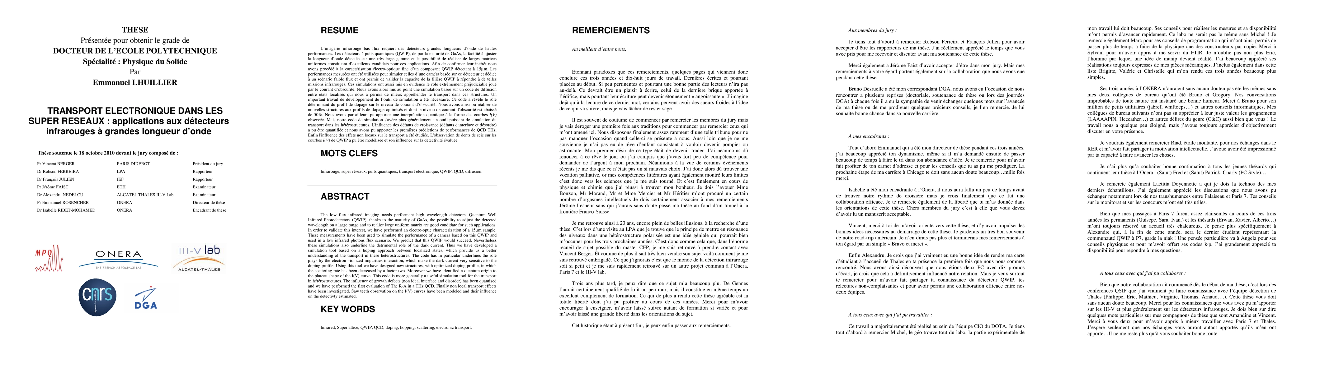 The low flux infrared imaging needs performant high wavelength detectors. Quantum Well Infrared Photodetectors (QWIP), thanks to the maturity of GaAs, the possibility to adjust the detected wavelength on a large range and to realize large uniform matrix are good candidate for such applications. In order to validate this interest, we have performed an electro-optic characterization of a 15{\mu}m sample. These measurements have been used to simulate the performance of a camera based on this QWIP and used in a low infrared photons flux scenario. We predict that this QWIP would succeed. Nevertheless these simulations also underline the detrimental role of the dark current. Thus we have developed a simulation tool based on a hoping approach between localized states, which provide us a better understanding of the transport in these heterostructures. The code has in particular underlines the role plays by the electron -ionized impurities interaction, which make the dark current very sensitive to the doping profile. Using this tool we have designed new structures, with optimized doping profile, in which the scattering rate has been decreased by a factor two. Moreover we have identified a quantum origin to the plateau shape of the I(V) curve. This code is more generally a useful simulation tool for the transport in h\'et\'erostructures. The influence of growth defects (non ideal interface and disorder) has been quantized and we have performed the first evaluation of The R0A in a THz QCD. Finally non local transport effects have been investigated. Saw teeth observation on the I(V) curves have been modeled and their influence on the detectivty estimated.