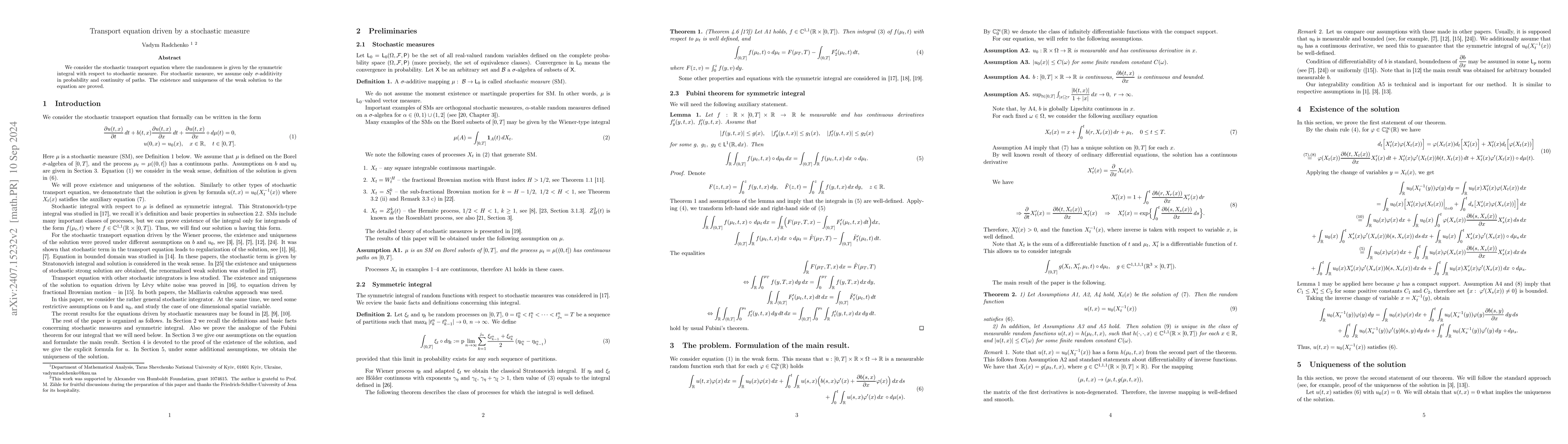 This paper proves the existence and uniqueness of a weak solution for a stochastic transport equation driven by a symmetric integral with respect to a stochastic measure, assuming only $\sigma$-additivity in probability and path continuity.
