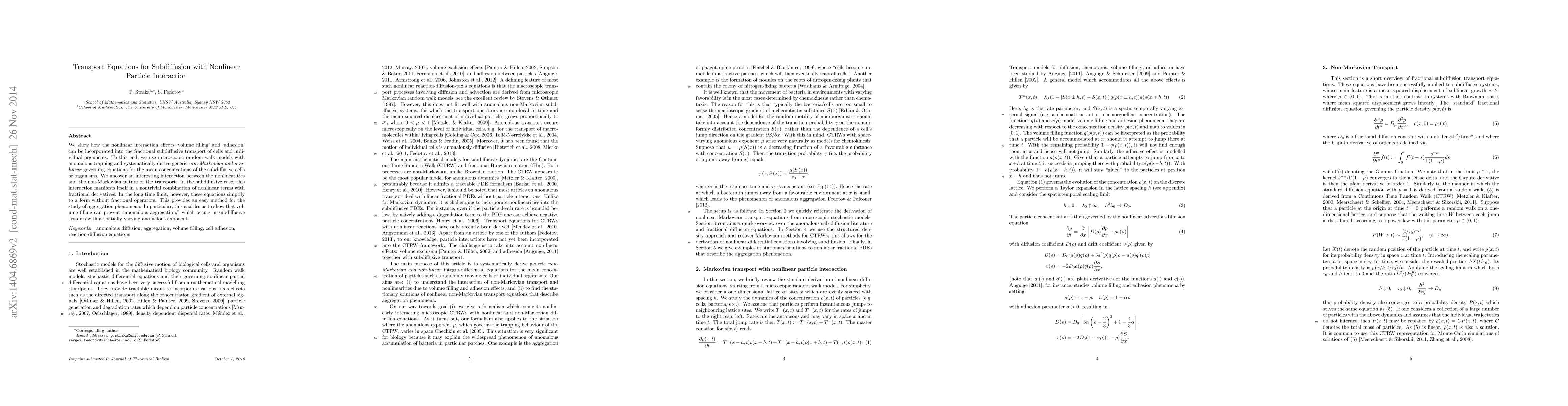We show how the nonlinear interaction effects `volume filling' and `adhesion' can be incorporated into the fractional subdiffusive transport of cells and individual organisms. To this end, we use microscopic random walk models with anomalous trapping and systematically derive generic non-Markovian and nonlinear governing equations for the mean concentrations of the subdiffusive cells or organisms. We uncover an interesting interaction between the nonlinearities and the non-Markovian nature of the transport. In the subdiffusive case, this interaction manifests itself in a nontrivial combination of nonlinear terms with fractional derivatives. In the long time limit, however, these equations simplify to a form without fractional operators. This provides an easy method for the study of aggregation phenomena. In particular, this enables us to show that volume filling can prevent "anomalous aggregation," which occurs in subdiffusive systems with a spatially varying anomalous exponent.