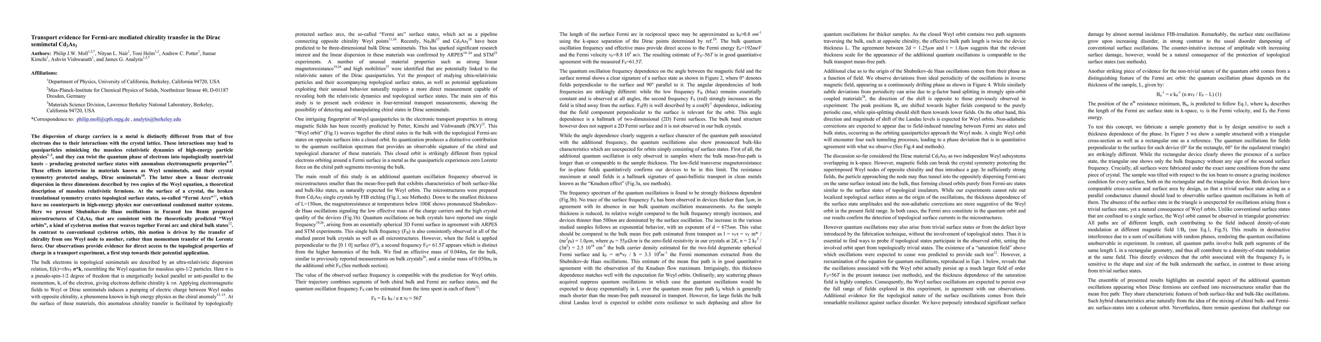 The research presents evidence for Fermi-arc mediated chirality transfer in the Dirac semimetal Cd3As2, utilizing Shubnikov-de Haas oscillations in Focused Ion Beam microstructures. These oscillations reveal unusual magnetic field periodicity and thickness-dependent behavior, explained by novel 'Weyl orbits' formed by weaving Fermi Arcs with chiral bulk states, demonstrating direct transport-based access to topological properties.