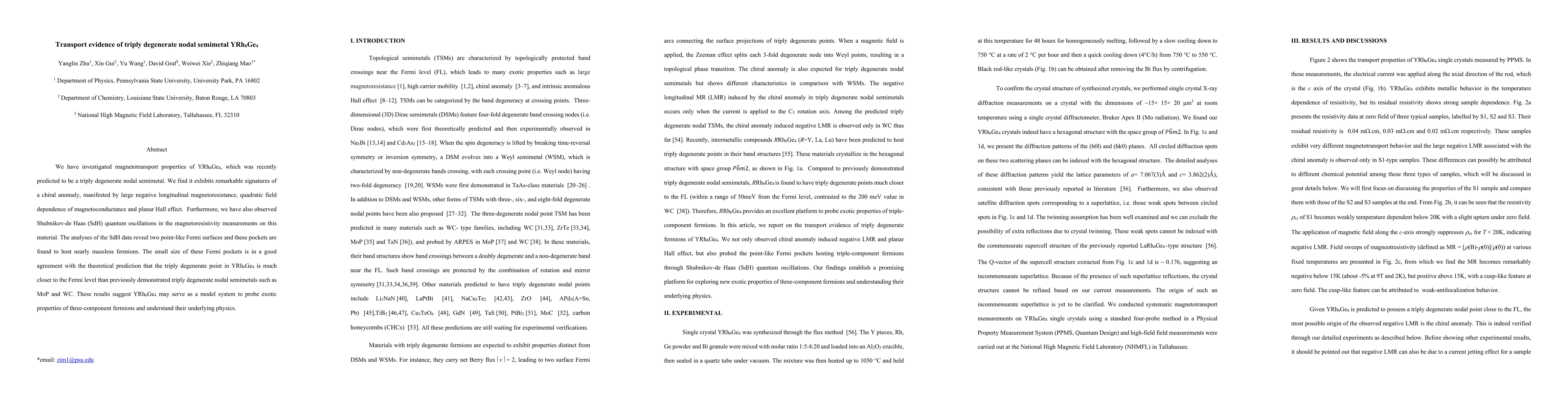 YRh6Ge4 demonstrates signatures of a triply degenerate nodal semimetal with chiral anomaly and nearly massless fermions, as evidenced by large negative longitudinal magnetoresistance and Shubnikov-de Haas quantum oscillations revealing small Fermi pockets. These findings position YRh6Ge4 as a model system for studying exotic three-component fermions.
